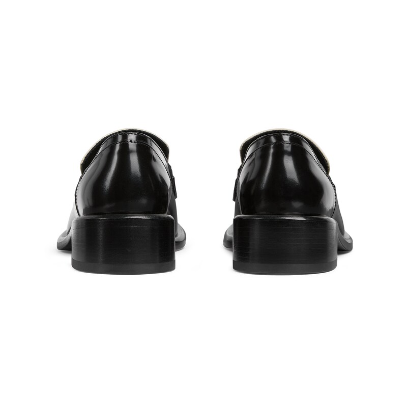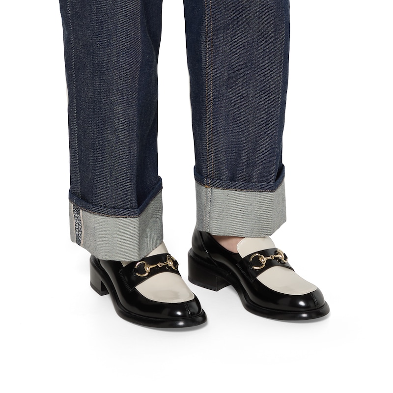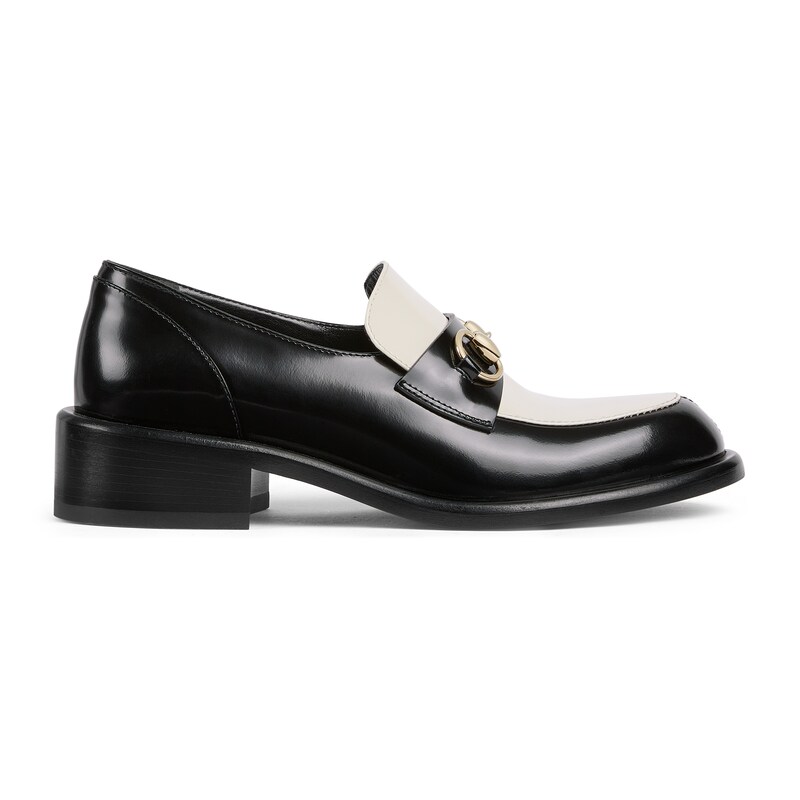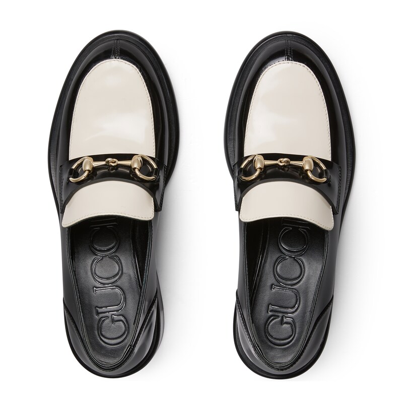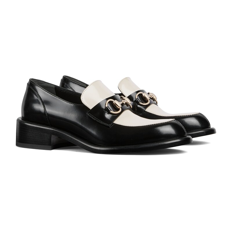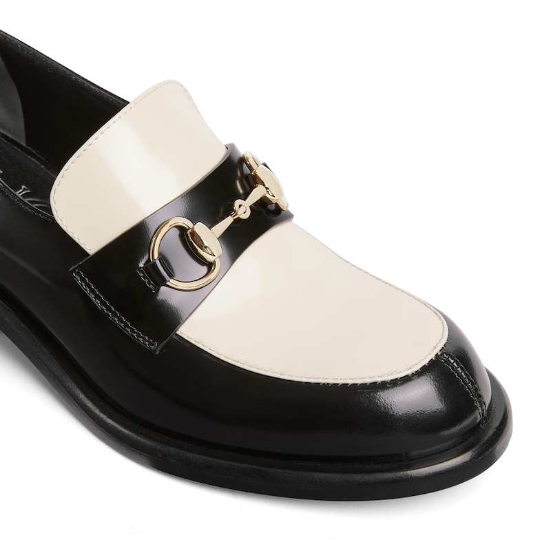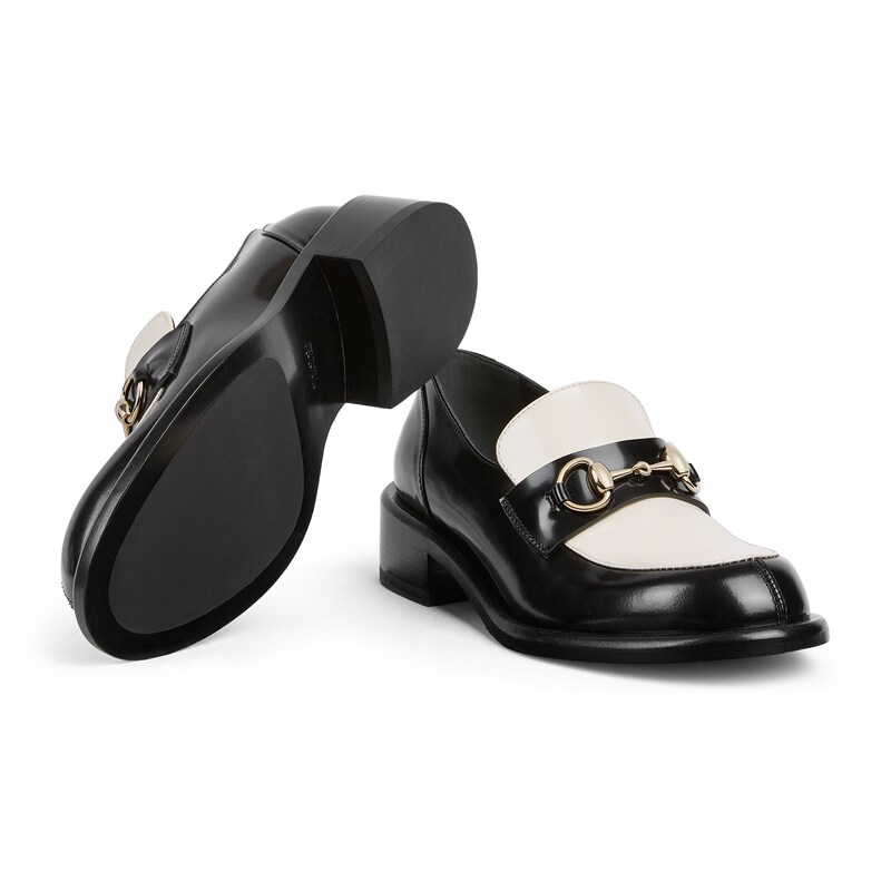 这款女士乐福鞋采用光滑亮面漆皮精心打造,缀饰浅金色调马衔扣配件,致敬品牌马术传承。