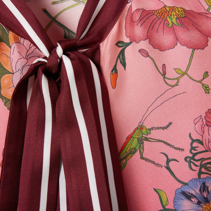 20世纪60年代问世的典藏Flora花卉印花生动装点多款成衣单品,以清新色调和渐变效果为2025早秋系列汇入浪漫气息。该印花匠心点缀于这款饰自系式领结的斜纹桑蚕丝衬衫之上,愈近下摆花意渐浓。