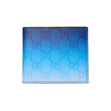 别开生面的蓝色调渐变效果印花为这款基础功能单品倍添时尚美感。这款双折钱包选用GG Monogram涂层织物制作,通体渐变印花尽展时尚风范。