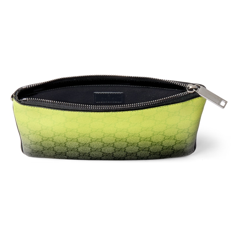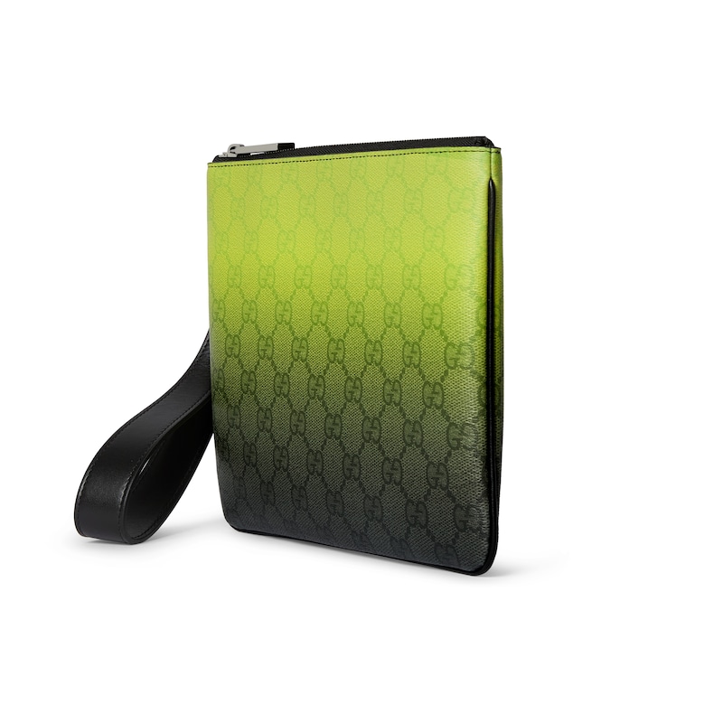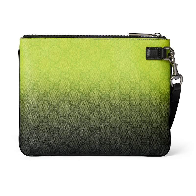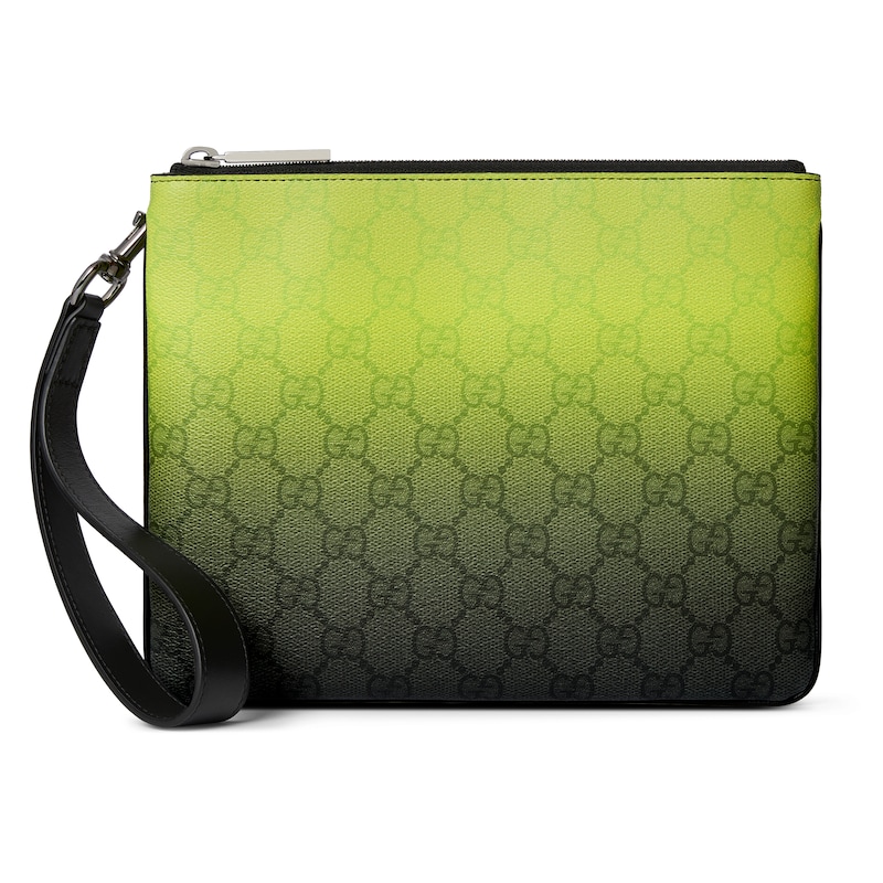 别开生面的绿色调渐变效果印花为这款基础功能单品倍添时尚美感。这款手拿包选用GG Monogram涂层织物制作,通体渐变印花尽显雅致格调。