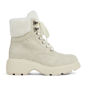 这款女士系带靴从登山运动中汲取灵感,将实用功能与经典风格巧妙融合。这款单品采用GG绒面材质匠心制作,搭配厚实美利奴羊毛衬里,为户外着装注入盎然新意。