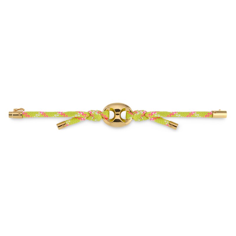 航海主题在Gucci 2025早秋珠宝系列中得以延续,船锚链坠饰成为装点各类颜色和饰面缆绳手链的点睛之笔。这款配饰可与其他秀场款手链叠搭佩戴,以黄色和多色织物匠心打造。