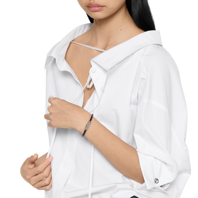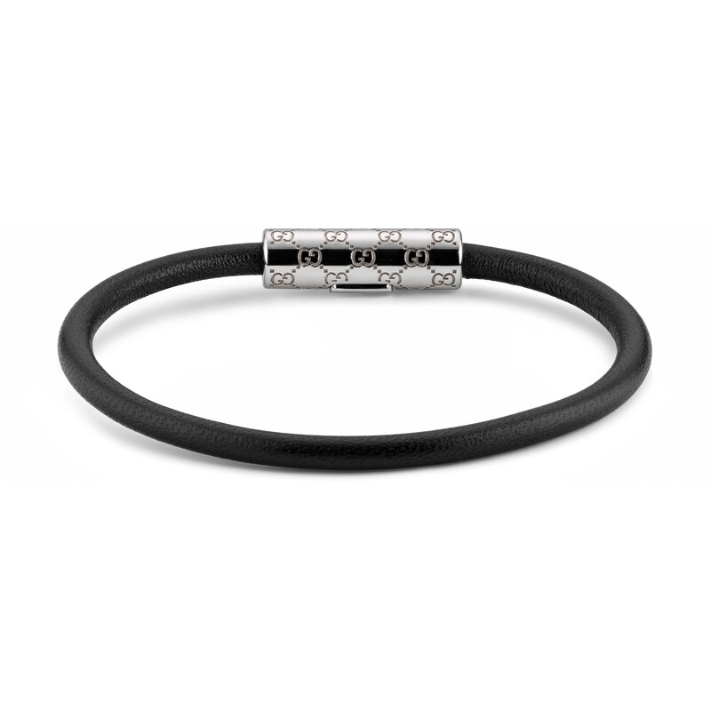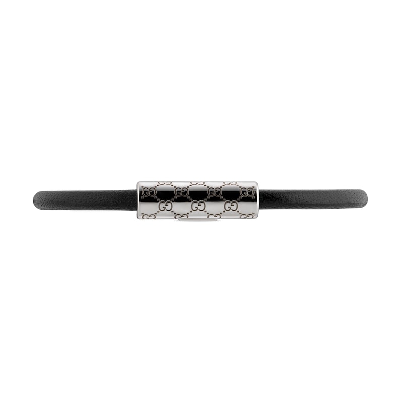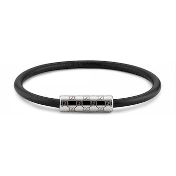 作为2025早秋系列时尚珠宝力作,这款皮革手链以别致的管状造型呈现,中央点缀镌刻经典GG图案的银色调钯金属饰件。采用按扣设计,开合轻松,佩戴方便。
