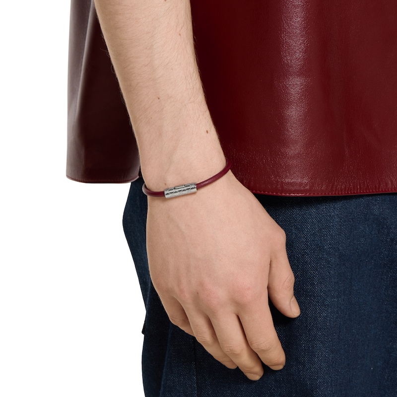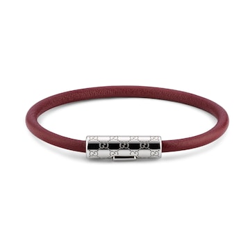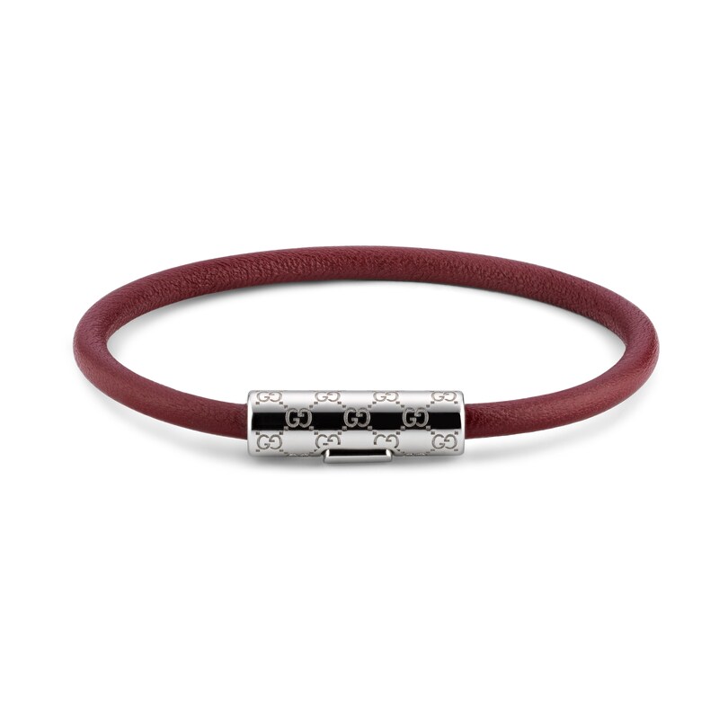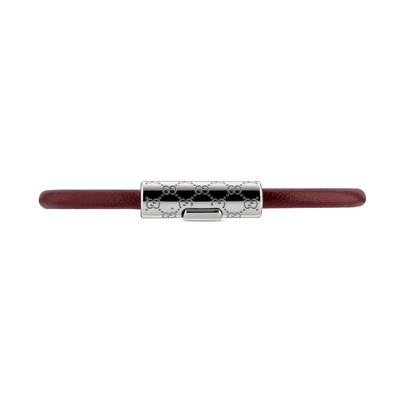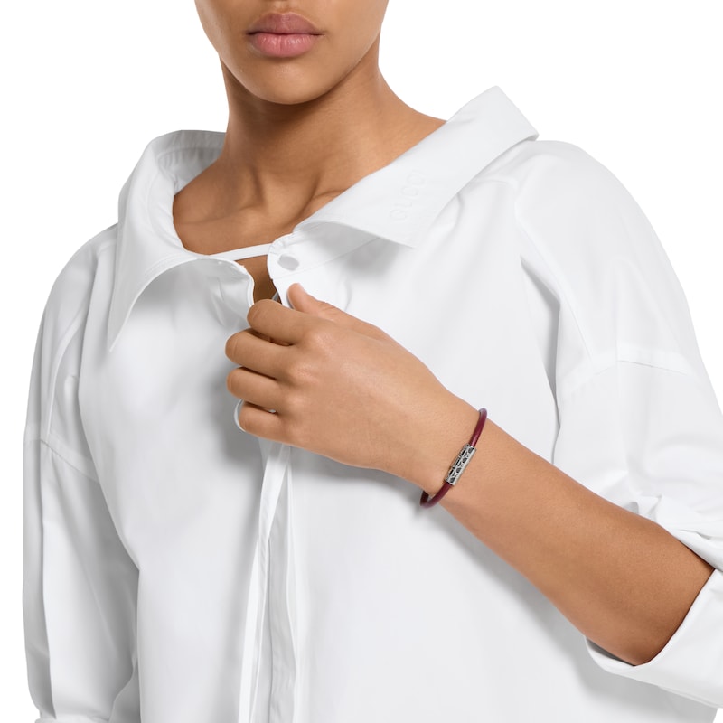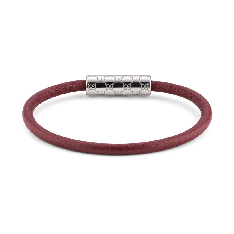 作为2025早秋系列时尚珠宝力作,这款皮革手链以别致的管状造型呈现,中央点缀镌刻经典GG图案的银色调钯金属饰件。采用按扣设计,开合轻松,佩戴方便。