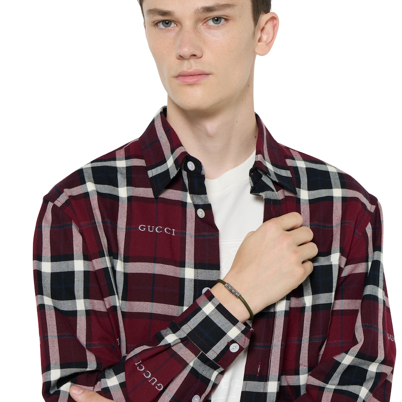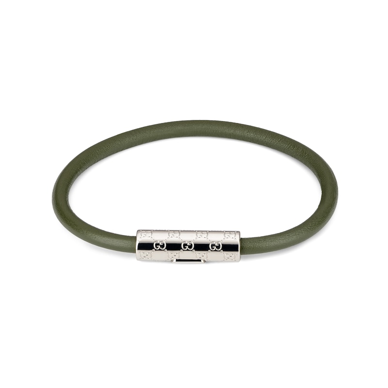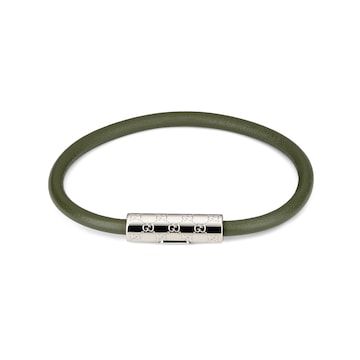 这款皮革手链采用圆筒廓形设计,中央的银色调钯金细节刻有品牌标志性GG图案。按扣开合设计,佩戴方便。