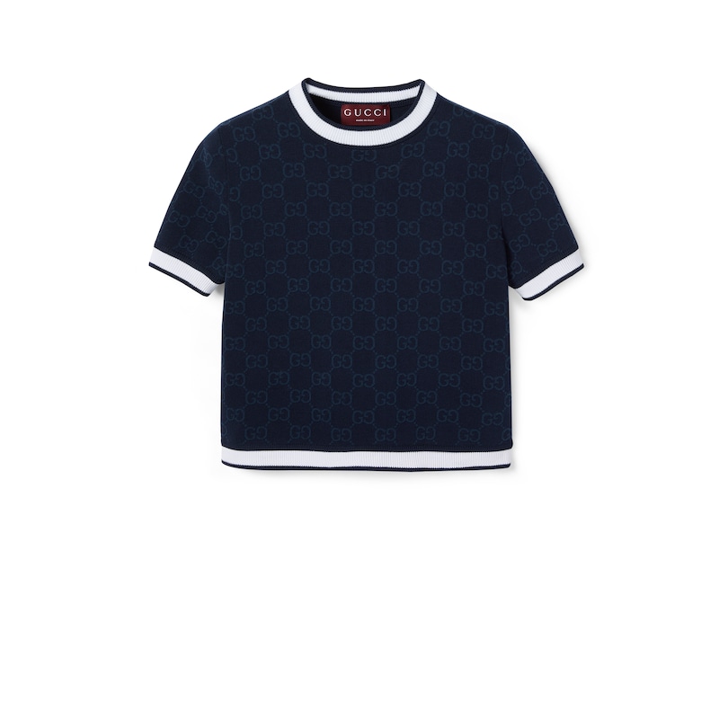 2025早秋系列将多样纹理和精致细节巧妙糅于一体。GG提花编织面料和精美细节同台献艺,宣告季节轮换,感受四时之美。这款上衣匠心缀饰通体GG图案,配以白色撞色滚边,平添精致美感。