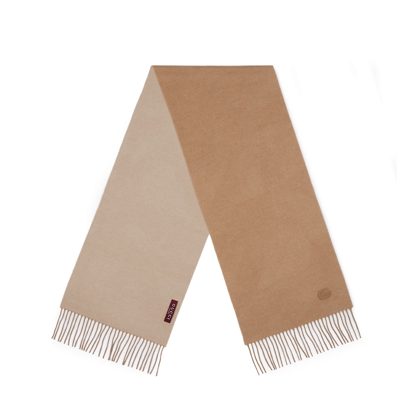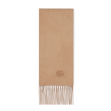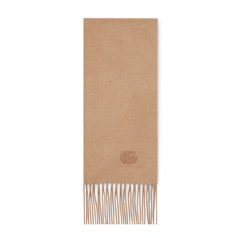 柔软桑蚕丝配饰系列以精致滚边、品牌标识贴饰和精美刺绣为品牌元素注入新鲜活力。这款山羊绒围巾缀饰双G皮革贴饰和同色调流苏滚边,令整款设计更添魅力。