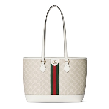 Ophidia系列以标志性条纹织带与浅金色调双G元素致敬品牌传承。这款托特包以白色GG字母交织图案涂层织物匠心打造,配以长款顶部提手和绿色棉质衬里,令整个设计更臻完满。