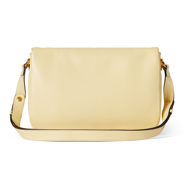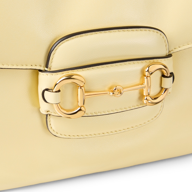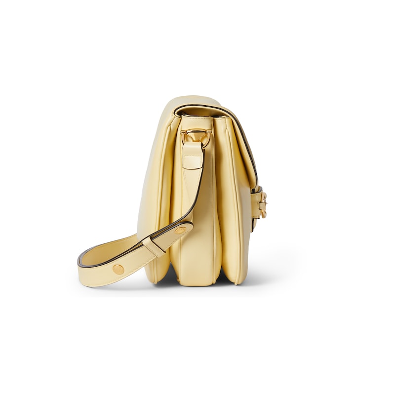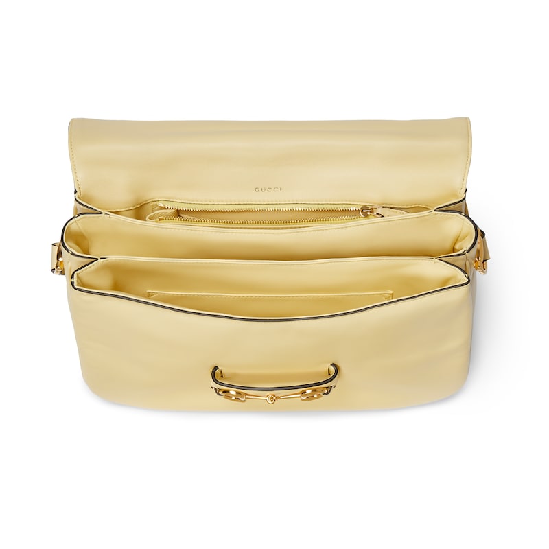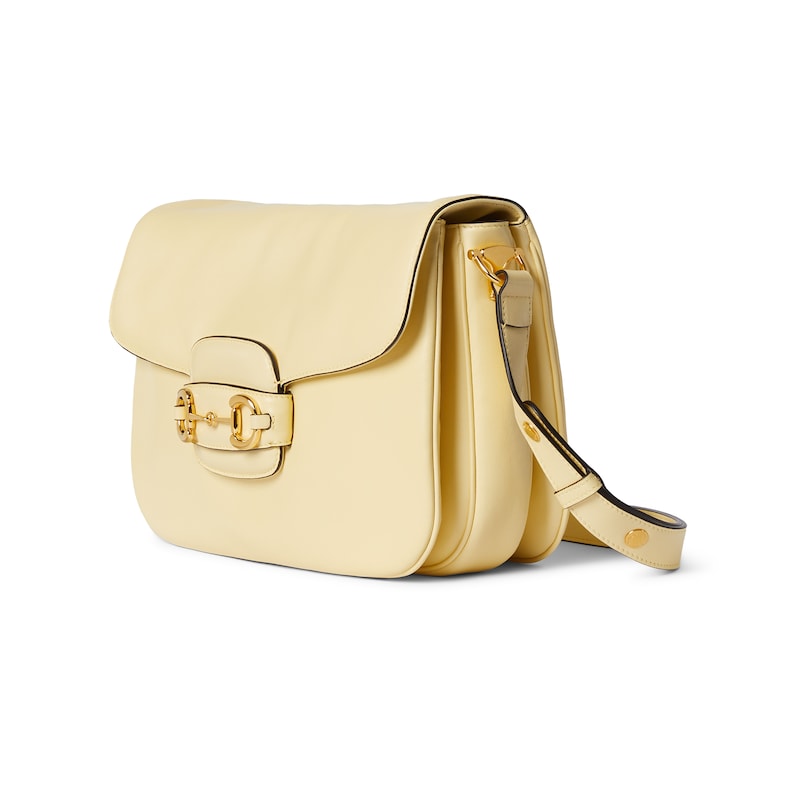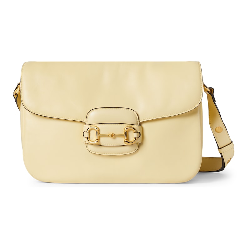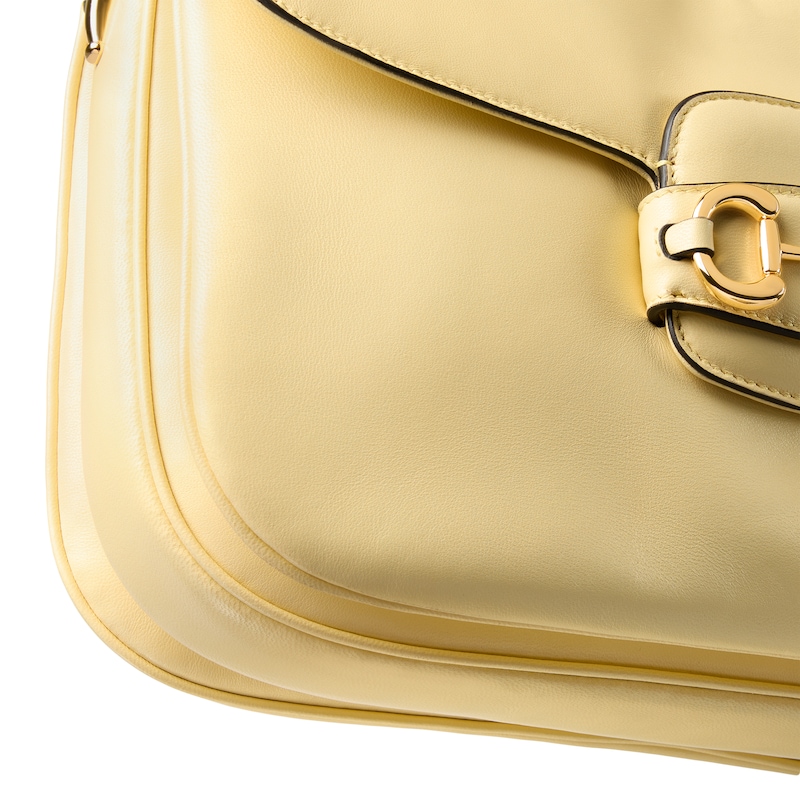 2025秋冬系列, 这款肩背包再现品牌马术风格设计,融蕴浅金色调细节与柔软光面皮革,搭配双环和长条配件,为Gucci Horsebit 1955系列添砖加瓦。