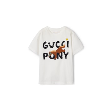 品牌童装系列以经典材质、精湛工艺与清新色调焕新诠释标志性图案。这款婴儿T恤甄选针织棉打造,精心缀饰“Gucci pony”和星星印花。