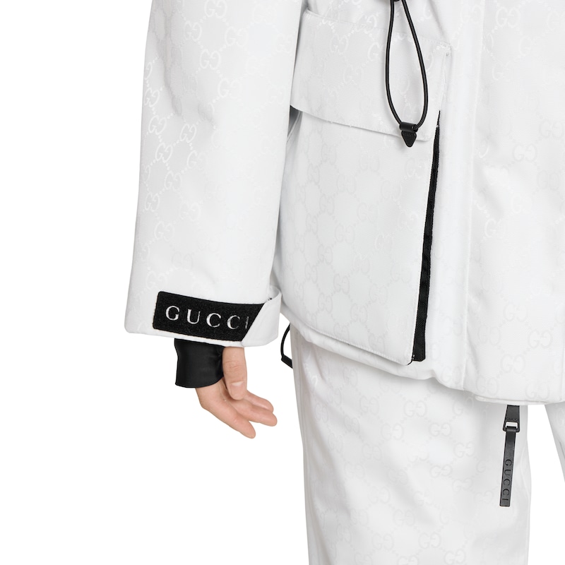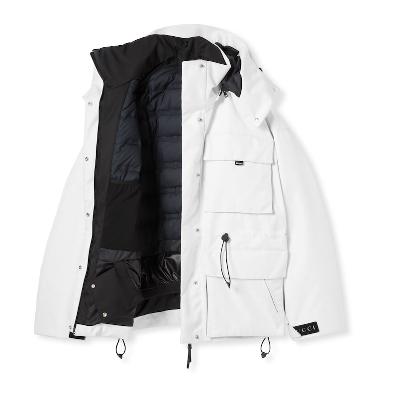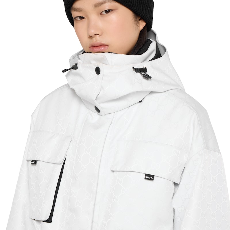 品牌推出首个冬季运动服系列Gucci Altitude,将出众性能与典藏元素巧妙融合。这款夹克采用立领和抽绳兜帽设计,选用三层GG锦纶提花面料精致而成,防水、防风、透气。