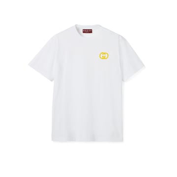 2026早春系列女士成衣致意Gucci时尚造型,以混色搭配趣致糅合品牌典藏元素与佛罗伦萨传承意蕴,呈现简洁风格与极繁设计等多元单品。这款T恤甄选细绒针织棉打造,缀饰互扣式双G厚绒布细节。