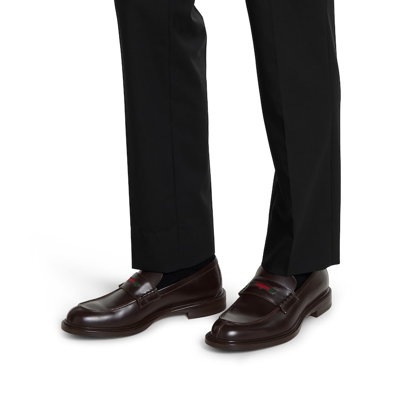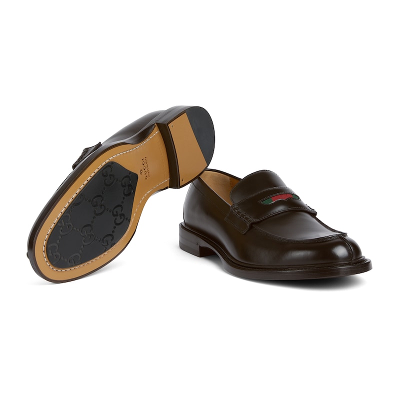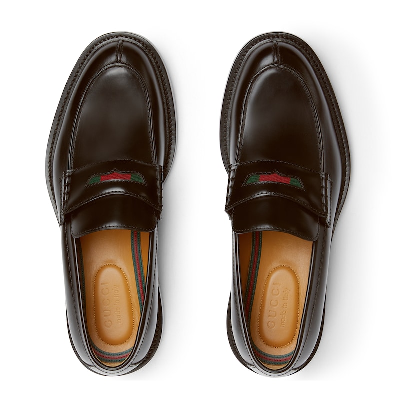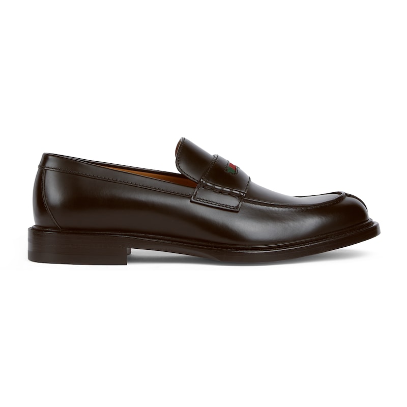 这款优雅乐福鞋采用柔软光面牛皮革制作。鞋面镶嵌红绿织带细节,增添低调而别致的标识元素。