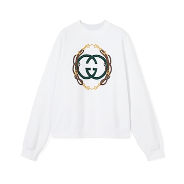 2026早春女士成衣系列致意Gucci时尚造型,以混色搭配趣致糅合品牌典藏元素与佛罗伦萨传承意蕴,呈现简洁风格与极繁设计等多元单品。这款卫衣甄选拉绒针织棉打造,巧妙融入饰缰绳刺绣互扣式双G印花。