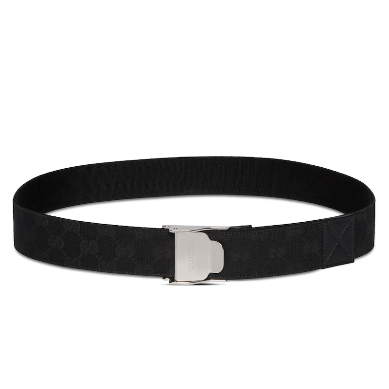 男士平针或印有标识的帆布腰带单品采用滑动式开合的运动风搭扣设计,演绎休闲造型。此款腰带选用GG帆布打造,搭配饰有Gucci刻花细节的个性搭扣。