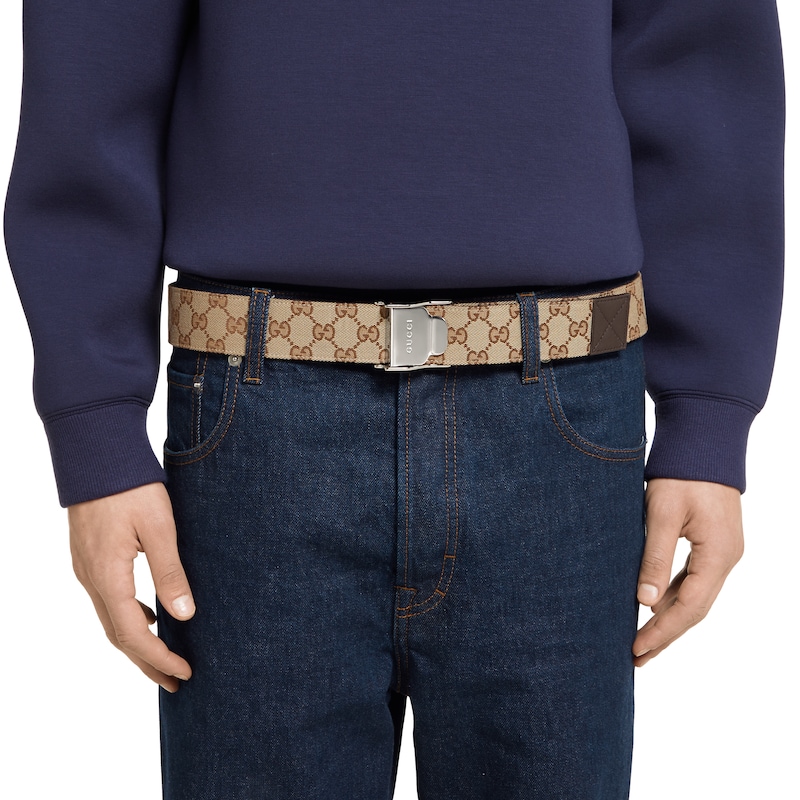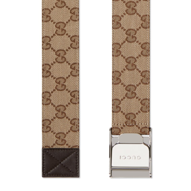 男士平针或印有标识的帆布腰带单品采用滑动式开合的运动风搭扣设计,演绎休闲造型。此款腰带选用GG帆布打造,搭配饰有Gucci刻花细节的个性搭扣。