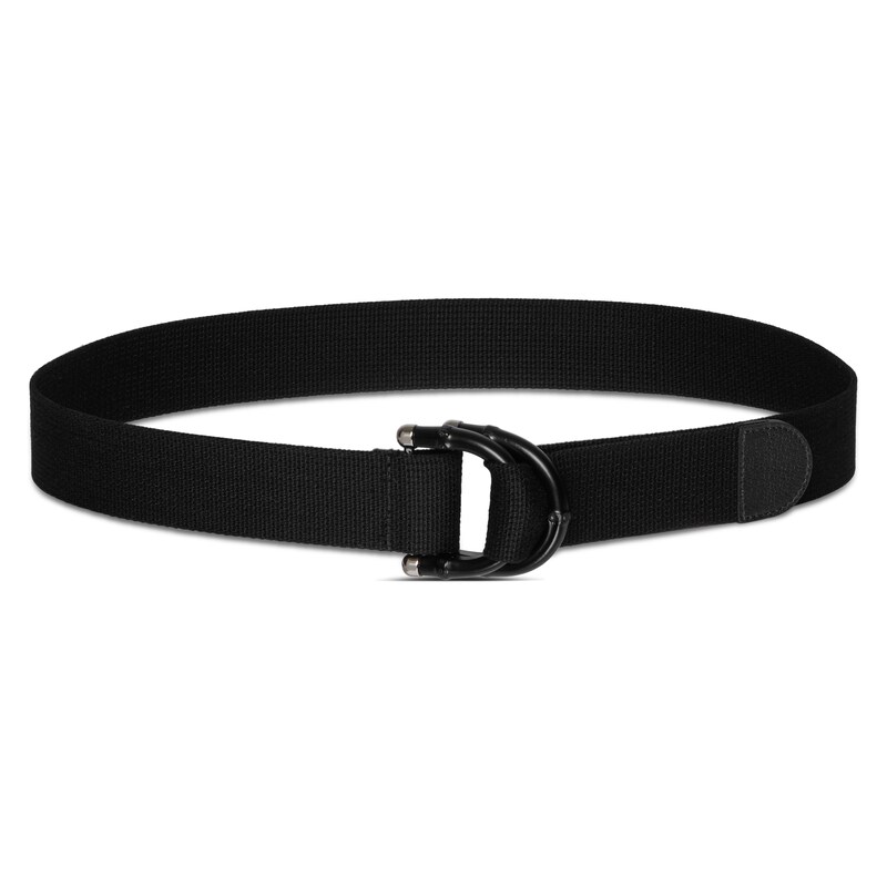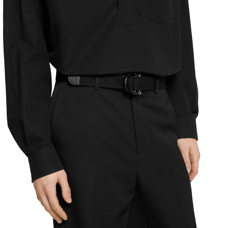 多款男士腰带创意缀饰新颖竹节造型D形环扣,巧妙呼应成衣系列的时尚格调。这款宽版腰带以黑色织物匠心呈现,黑色饰面竹节搭扣更添魅力点缀。