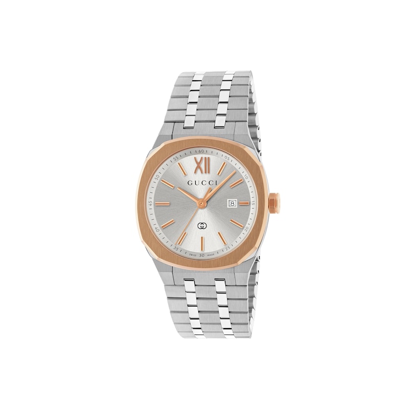 全新GUCCI 25H系列腕表以利落廓形呈现,融入精致元素,尽显时尚设计。搭载石英机芯,这款腕表配备精钢可更换表链与饰粉金色调表圈精钢表壳。
