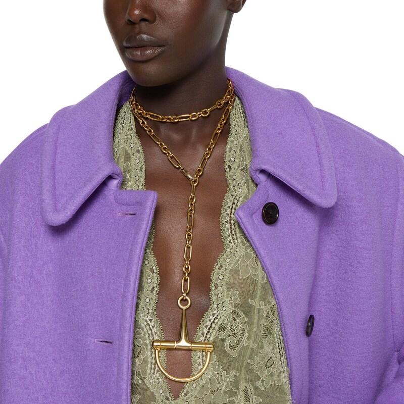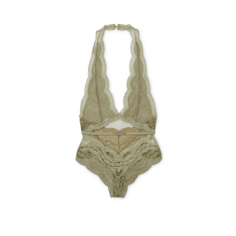 2025秋冬系列中的这款连体衣采用绿色弹力花卉蕾丝薄纱匠心打造。选用深V领设计,可拆卸褶饰松紧腰带搭配Gucci金属搭扣更添考究细节。