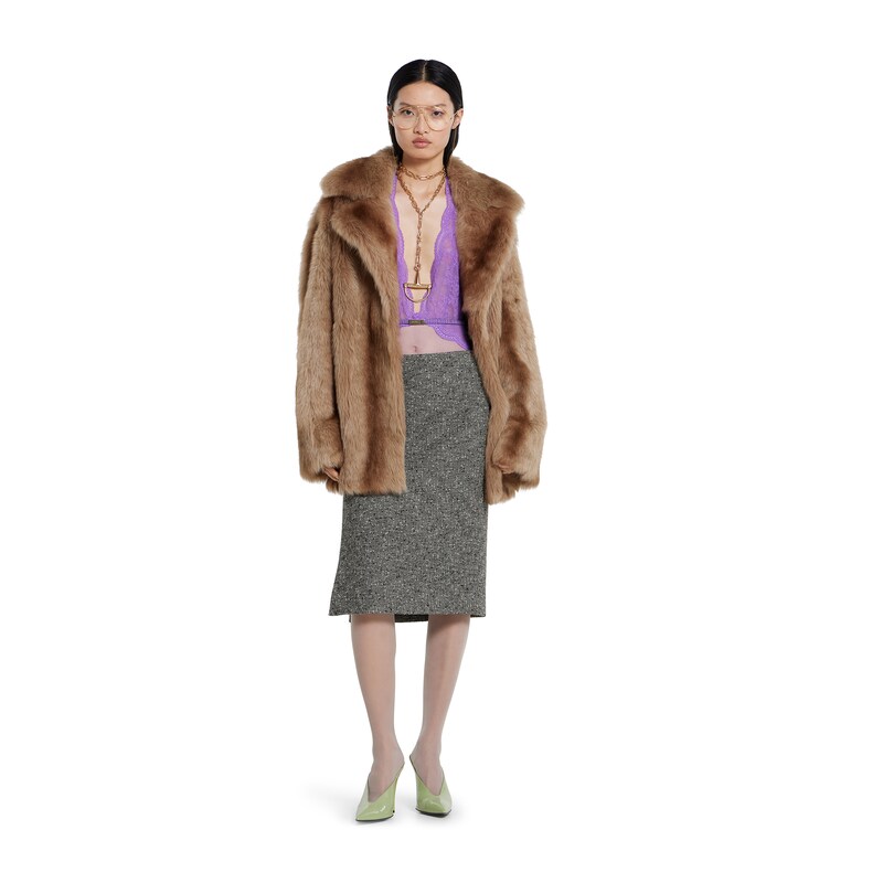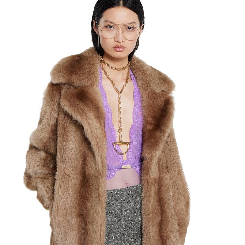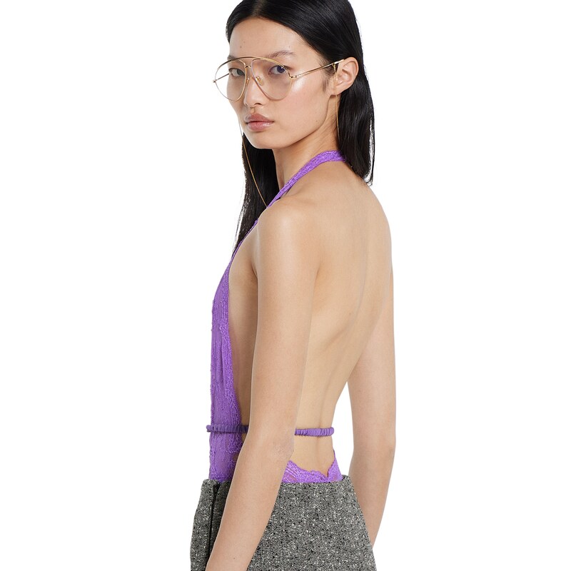 2025秋冬系列的这款连体衣采用紫色弹力花卉蕾丝薄纱匠心打造。选用深V领设计,可拆卸褶饰松紧腰带搭配Gucci金属搭扣更添考究细节。