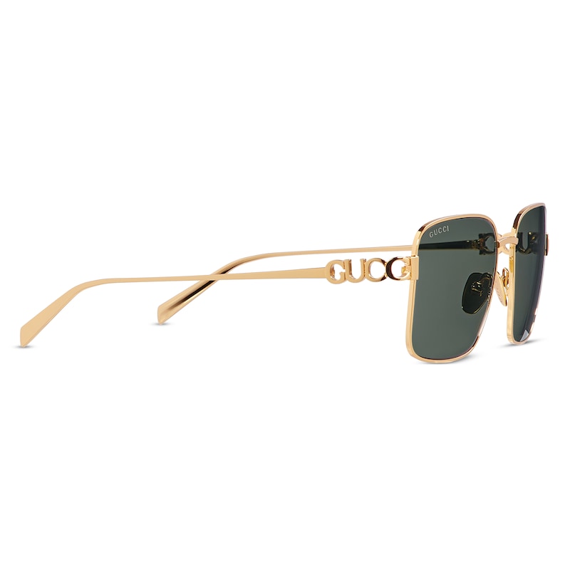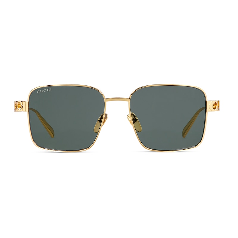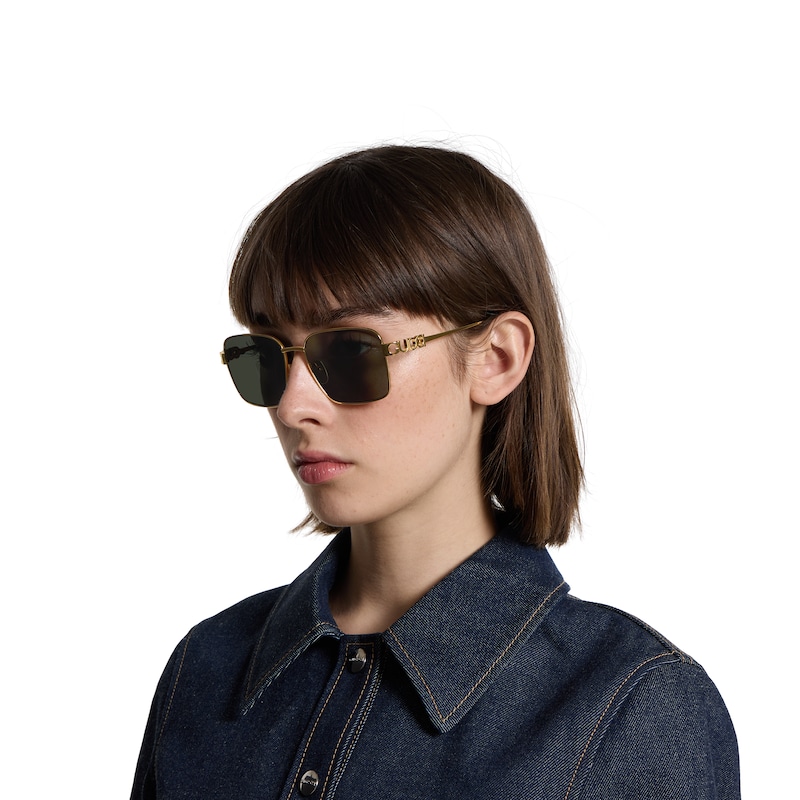 2025早秋眼镜系列将品牌典藏设计中的别致廓形与现代精髓巧妙糅为一体。这款方形镜框太阳眼镜以浅金色调金属打造,匠心融蕴镂空Gucci标识细节。