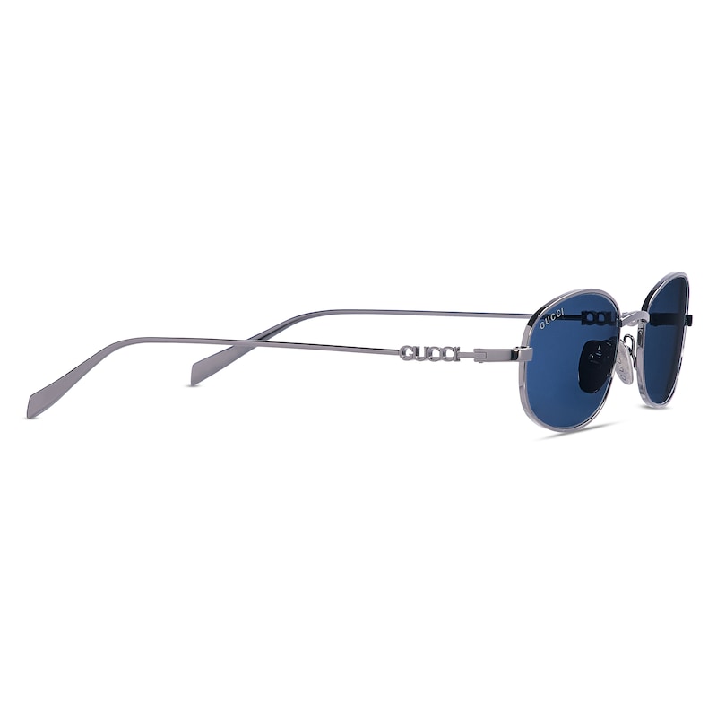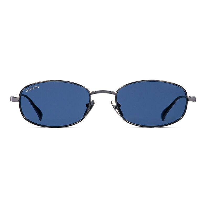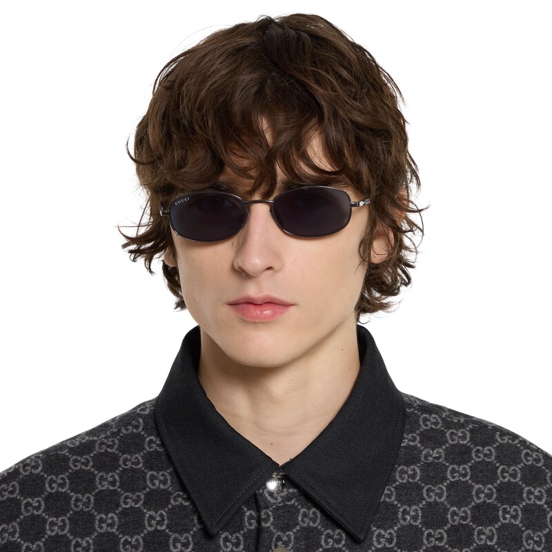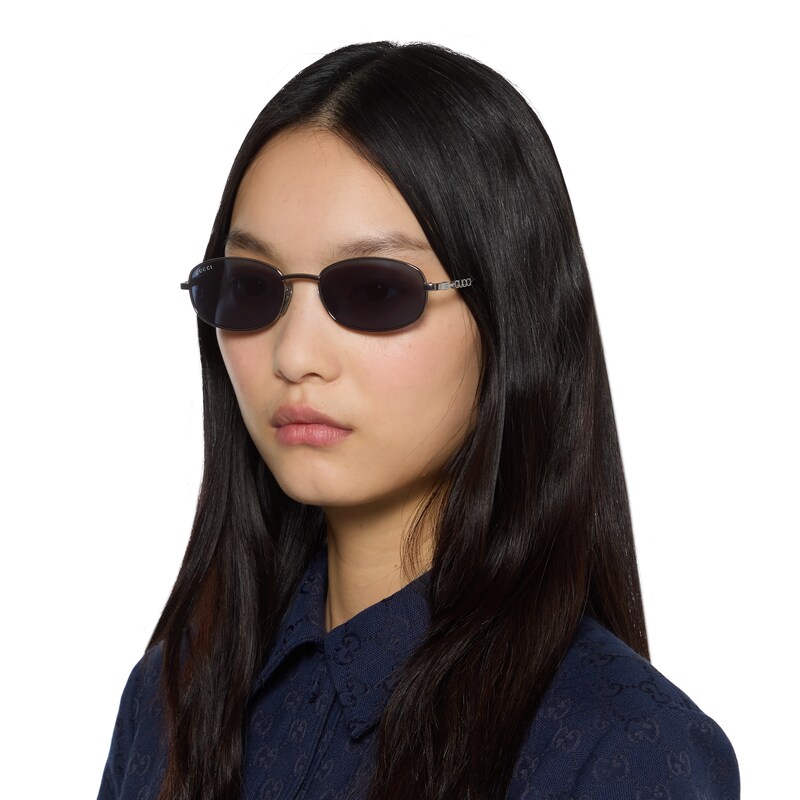 2025早秋眼镜系列将品牌典藏设计中的别致廓形与现代精髓巧妙糅为一体。这款椭圆形镜框太阳眼镜以钌色调金属打造,匠心融蕴镂空Gucci标识。