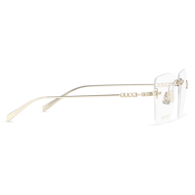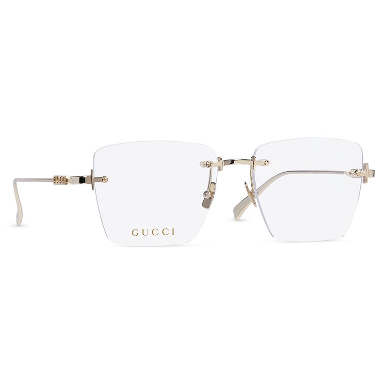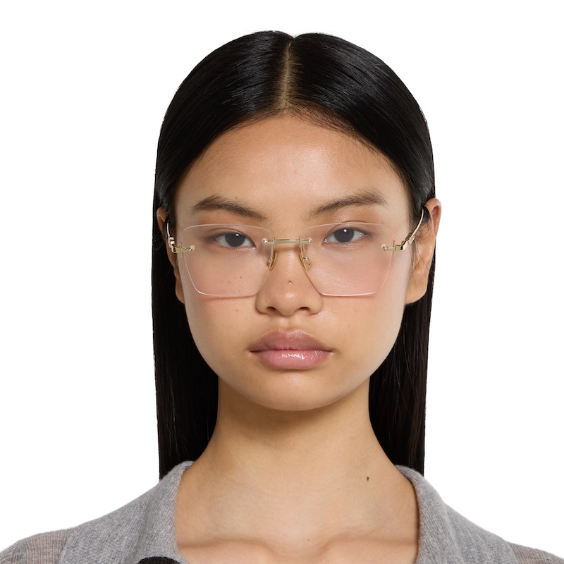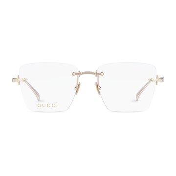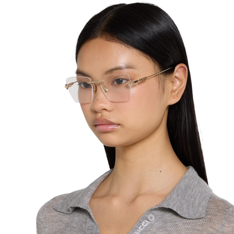 2025早秋眼镜系列将品牌典藏设计中的别致廓形与现代精髓巧妙糅为一体。这款眼镜的方形镜框以浅金色调金属打造,匠心融蕴镂空Gucci标识。