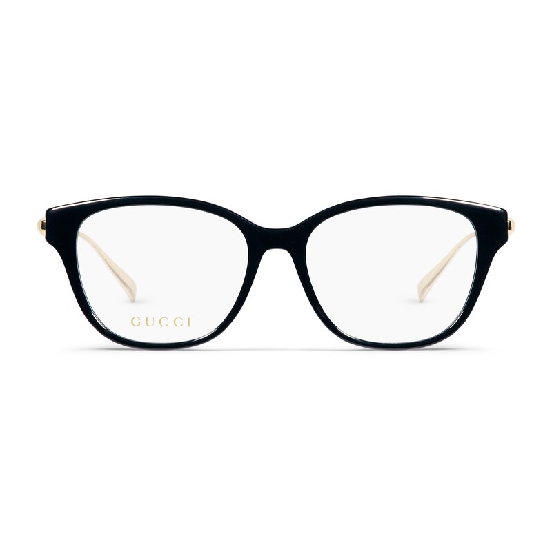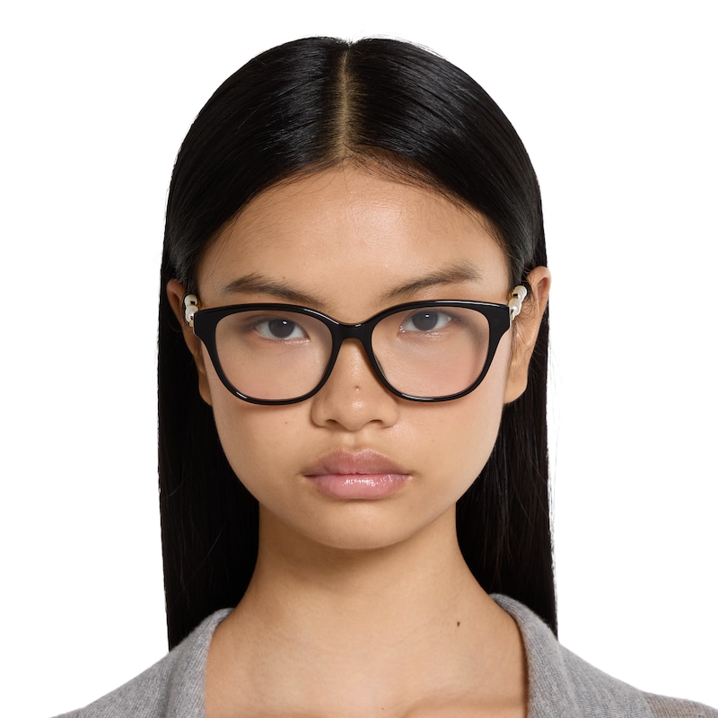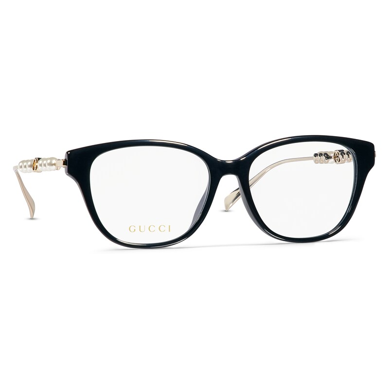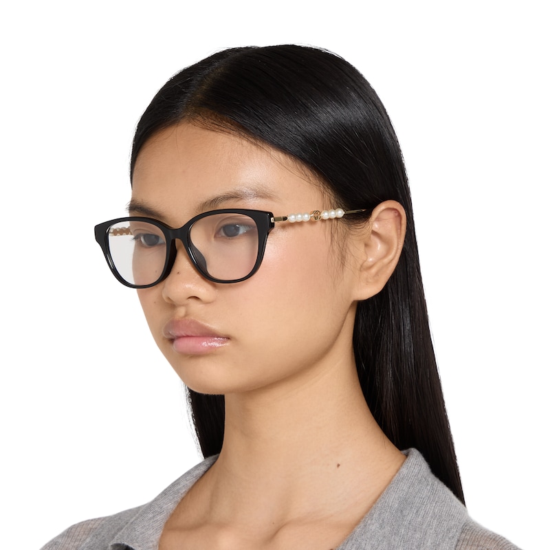 2025早秋眼镜系列将品牌典藏设计中的别致廓形与现代精髓巧妙糅为一体。这款眼镜的椭圆形镜框采用贴合设计,以黑色醋纤和浅金色调金属打造,匠心融蕴珍珠和镂空互扣式双G。