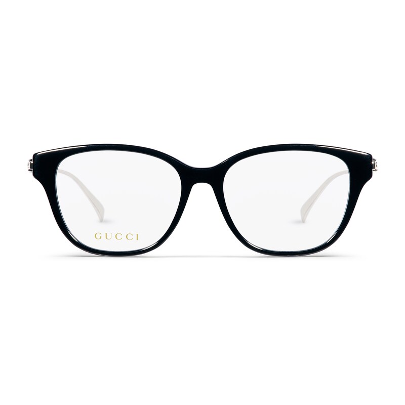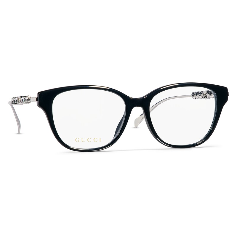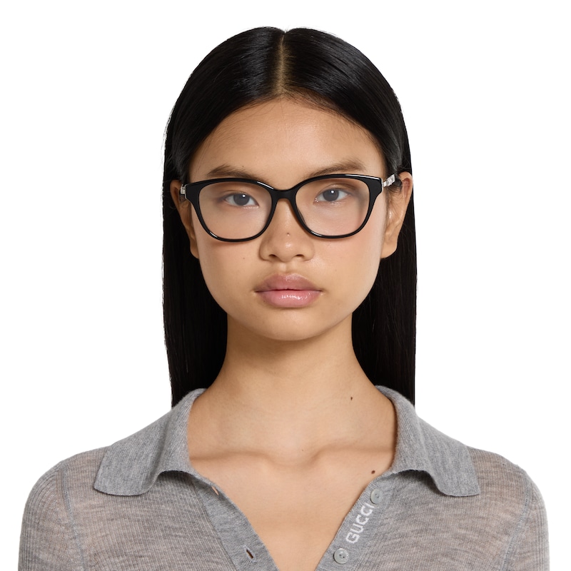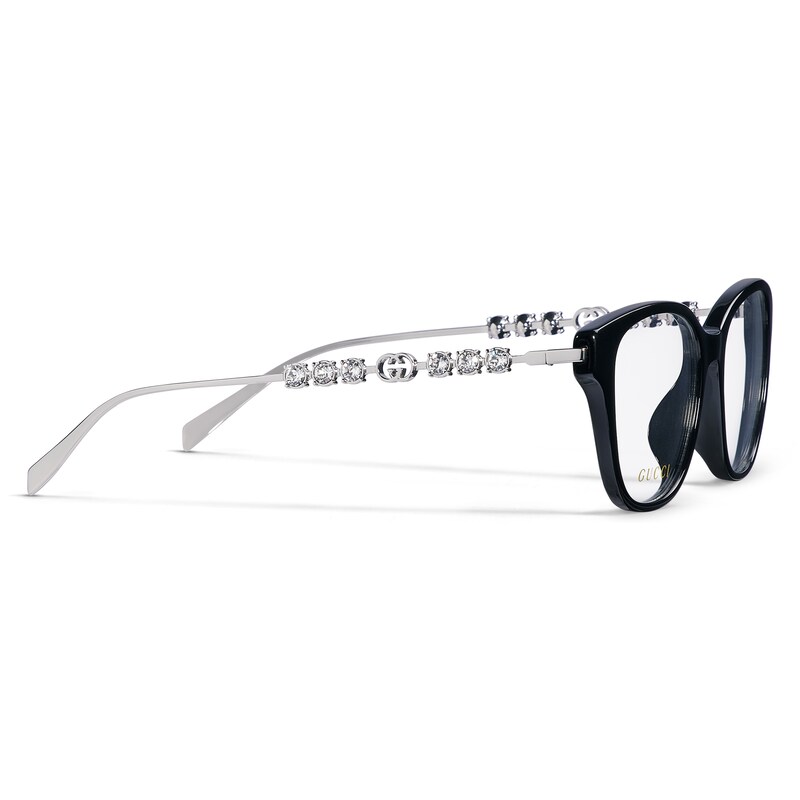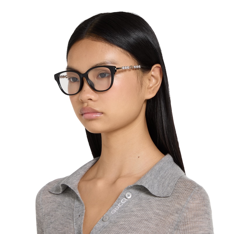 2025早秋眼镜系列将品牌典藏设计中的别致廓形与现代精髓巧妙糅为一体。这款眼镜的椭圆形镜框采用贴合设计,以黑色醋纤和银色调金属打造,匠心融蕴水晶铆钉和镂空互扣式双G。