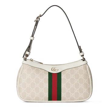Ophidia系列以标志性条纹织带与浅金色调双G元素致敬品牌传承。这款肩背包以白色GG字母交织图案涂层织物匠心打造,配以绿色棉质衬里;既可使用可调节提手,亦可搭配附赠肩带肩背或斜挎。