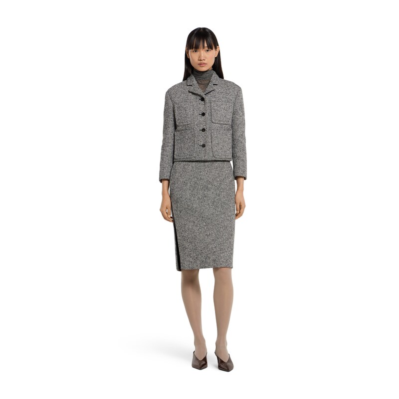 这款半身裙正面精心缀饰金属标识细节,为2025秋冬系列增添亮眼力作。这款单品采用全衬里设计,匠心搭配背面开衩与拉链开合。