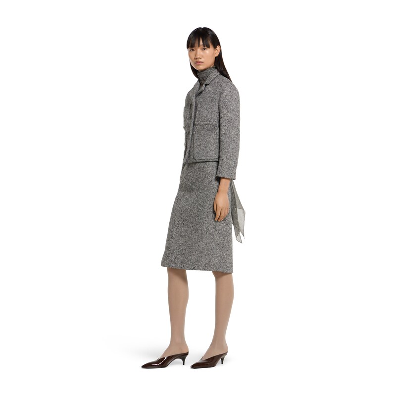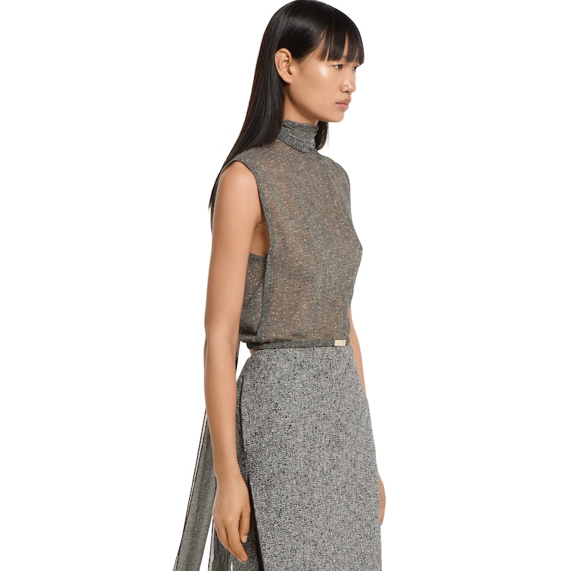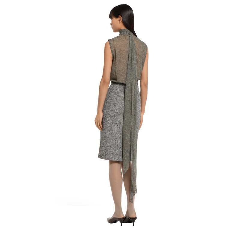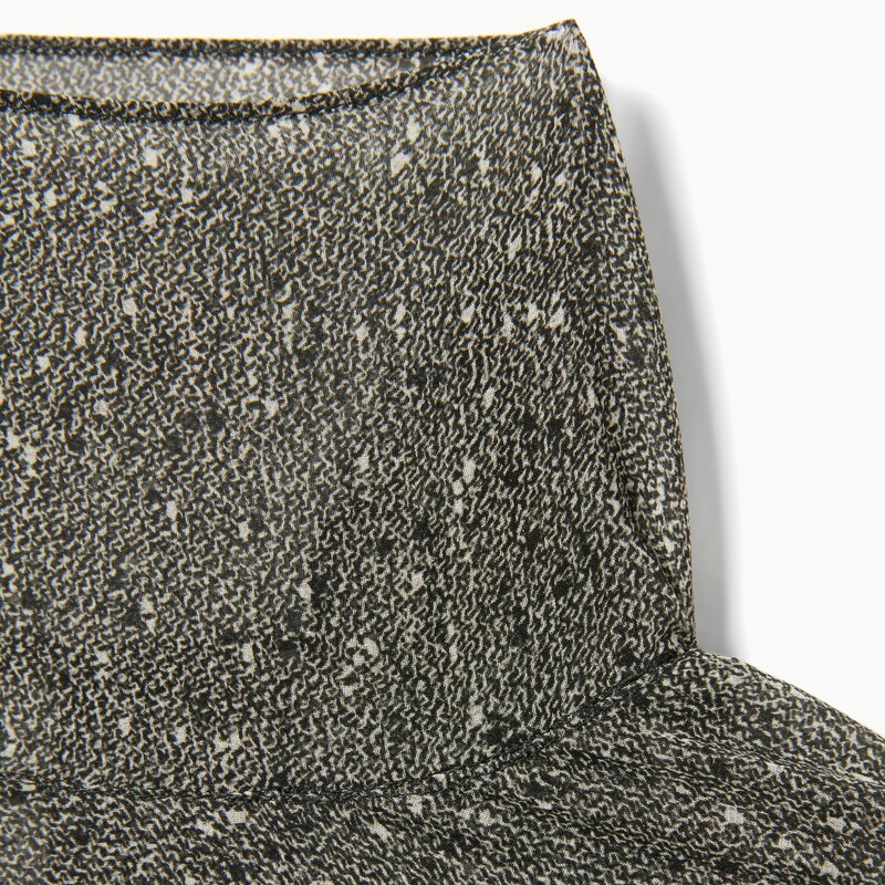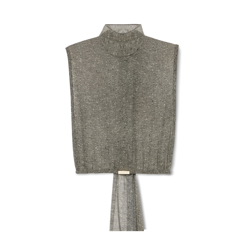 2025秋冬系列中的这款无袖上衣搭配长度及地自系式领结和通体颗粒感纹理印花。包扣门襟和可拆卸衬里更添魅力。