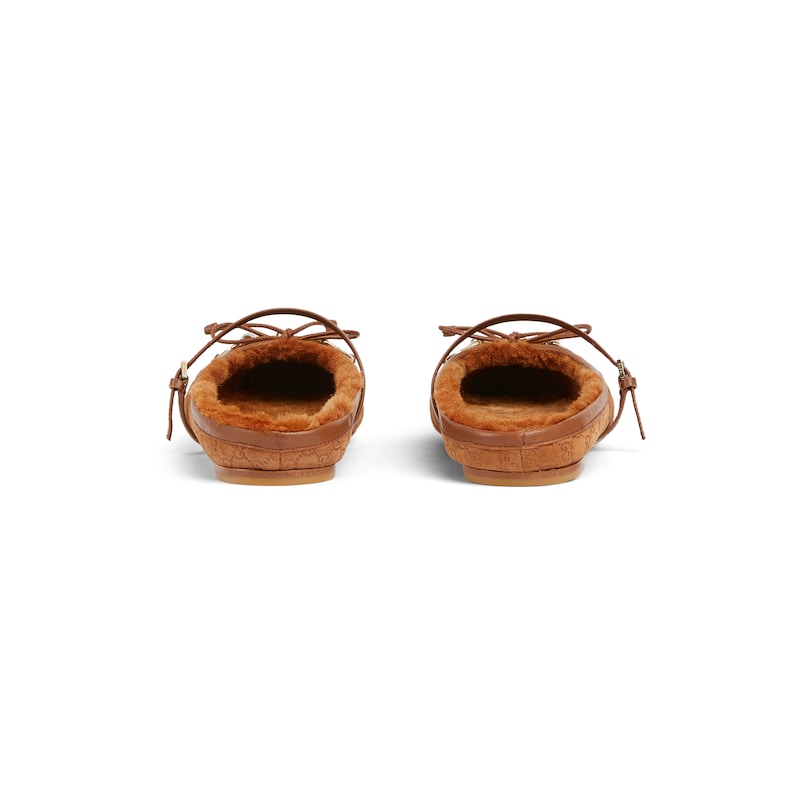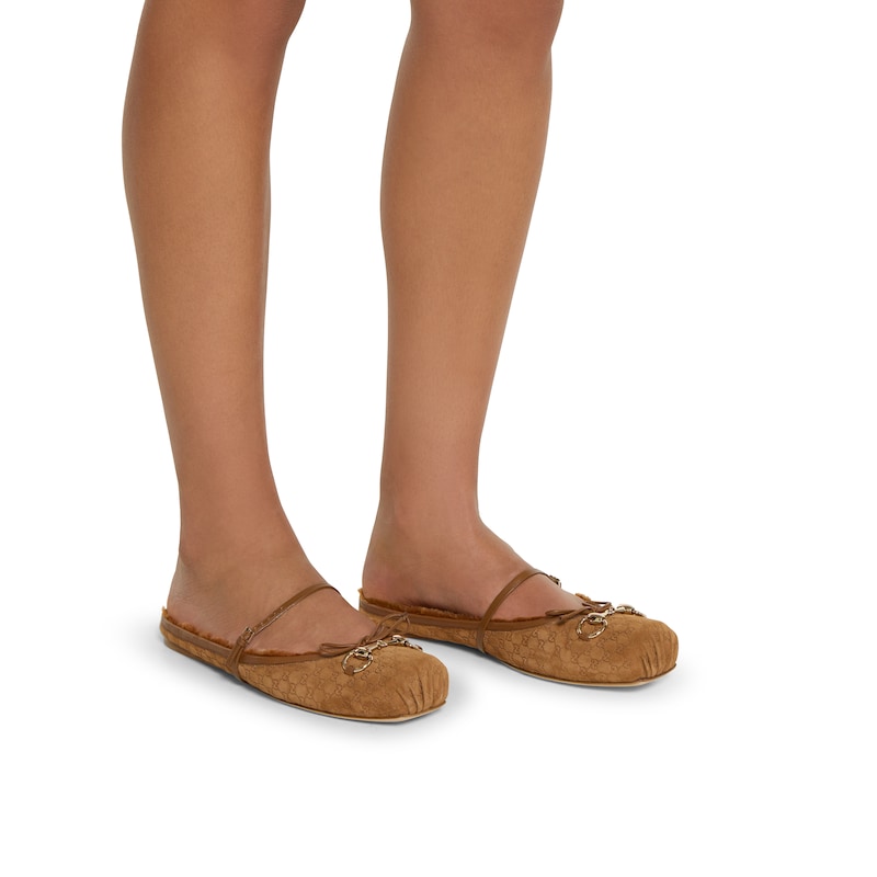 2025秋冬系列, 这款马衔扣平底芭蕾穆勒鞋选用方形收口鞋头设计,搭配雅致的蝴蝶结细节,致敬传统芭蕾舞鞋款型。这款单品以GG绒面材质匠心打造,缀饰浅金色调配件。“sacchetto”构造确保出色的舒适感。