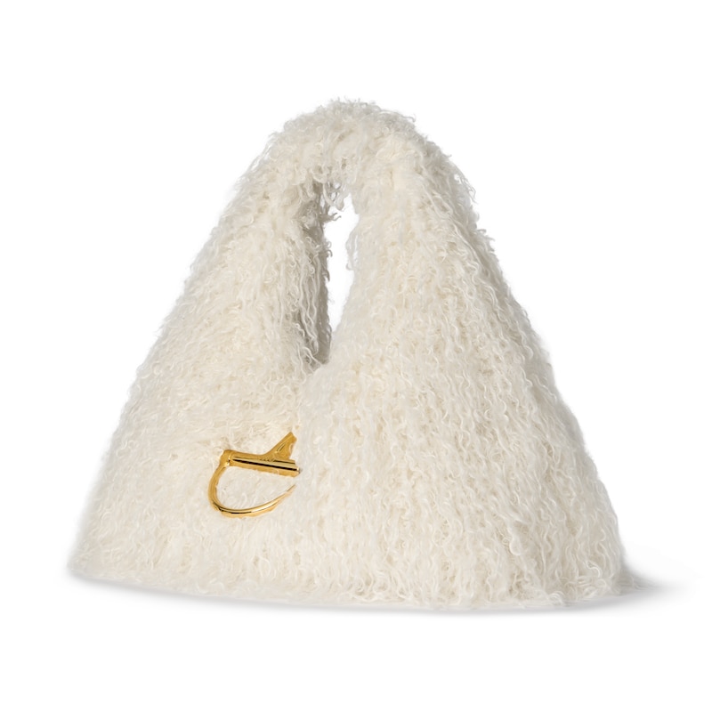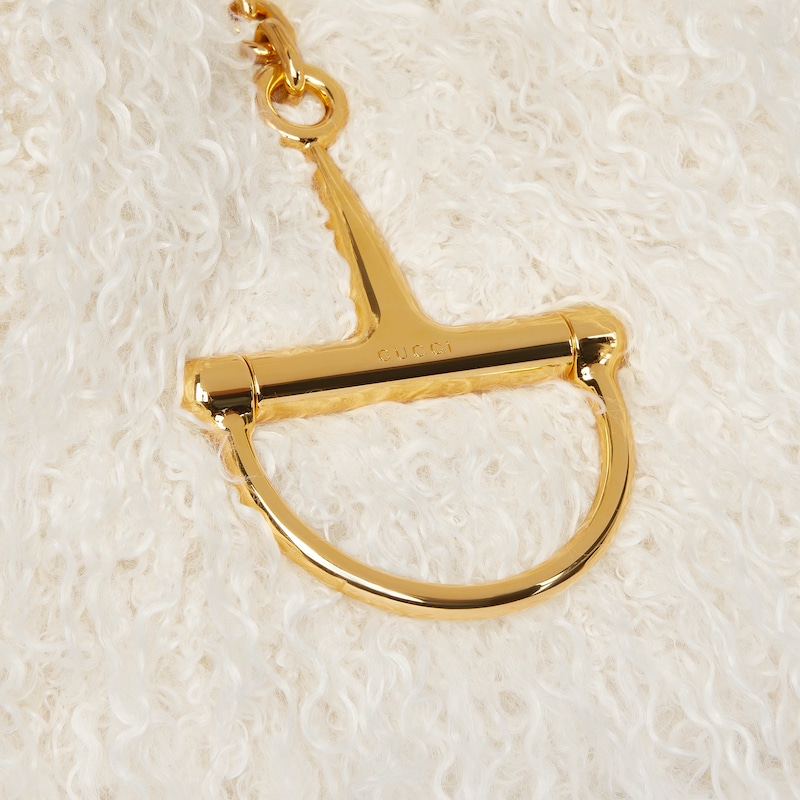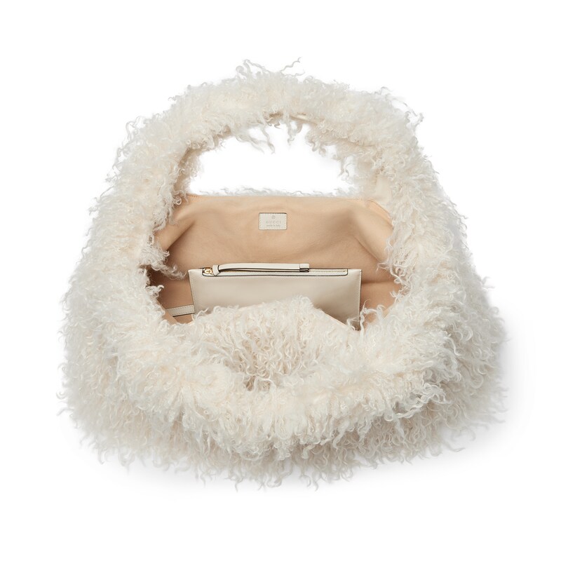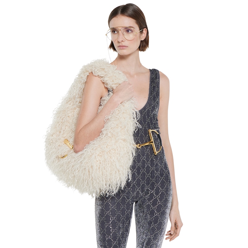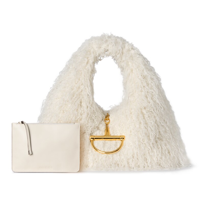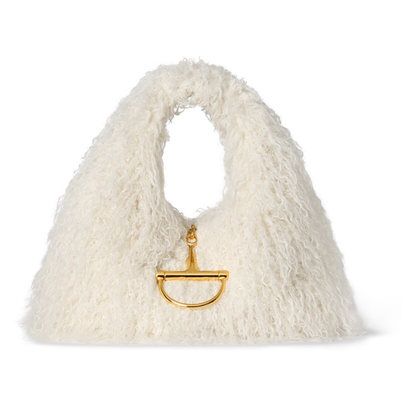 2025秋冬系列, 这款全新Gucci Softbit系列手袋以超大半马衔扣造型焕新演绎品牌经典配件。休闲廓形搭配磁扣设计,以纹理丰富的长毛绒织物匠心打造,兼具美感与实用功能。