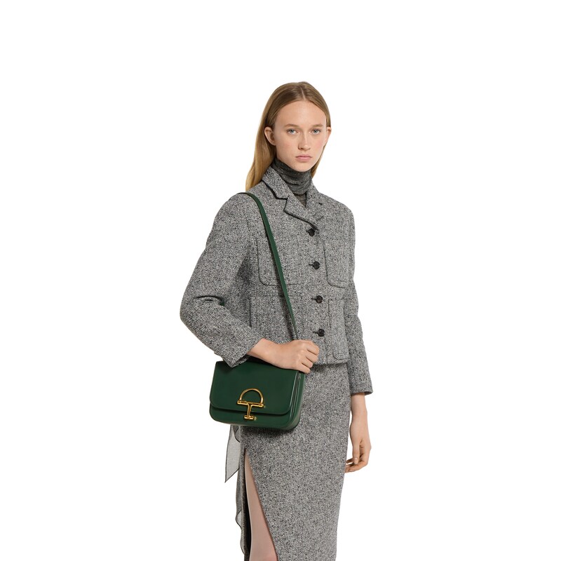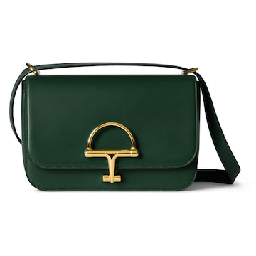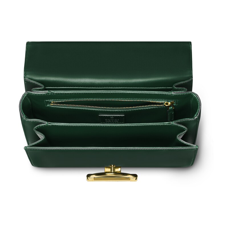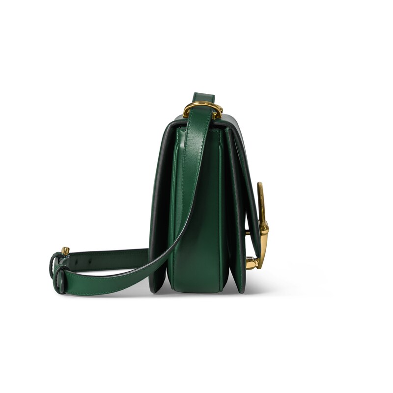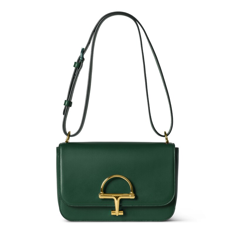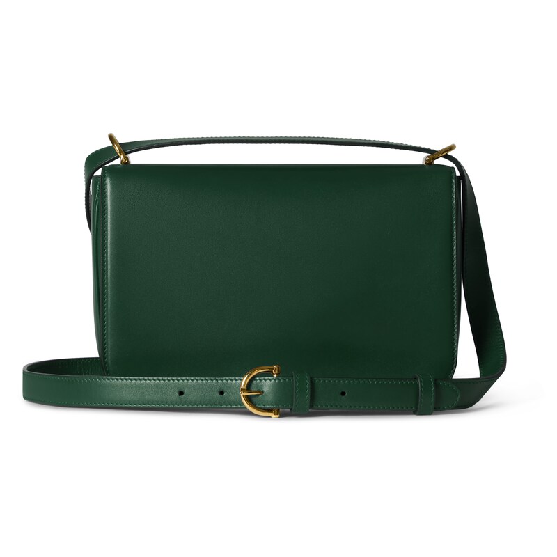 2025秋冬系列, Gucci Siena系列小号肩背包延续了Gucci经典马衔扣这一标志性元素的演变。这款肩背包选用精细光面皮革匠心打造,挺括造型融蕴源自20世纪70年代的半马衔扣搭扣设计细节。搭配金色调配件,内部衬里设有三层接档与一个拉链口袋。