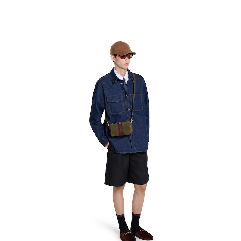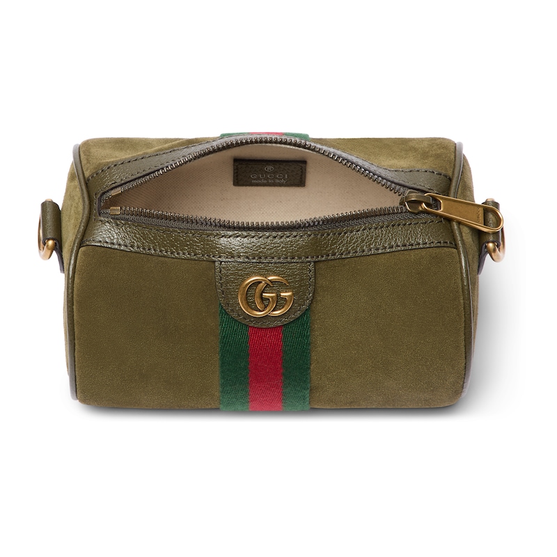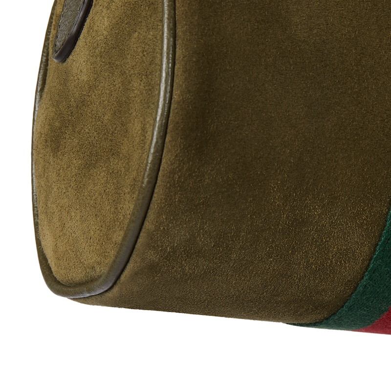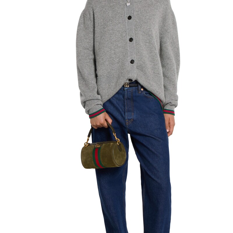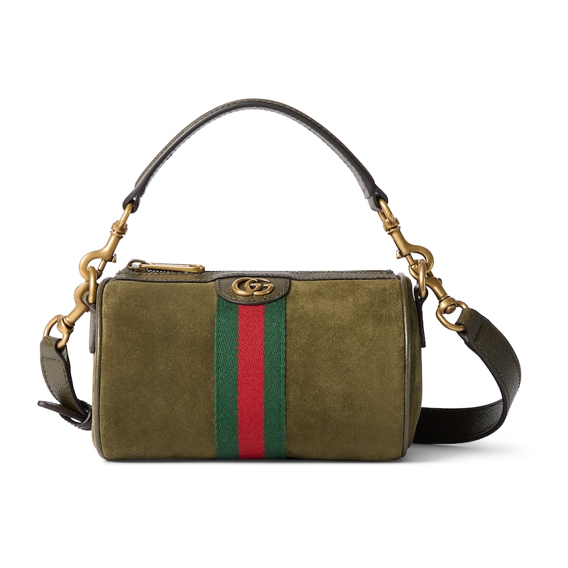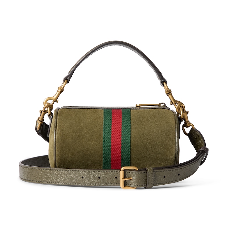 Ophidia系列匠心融蕴条纹织带和金色调双G标识,为2025秋冬季系列再添新作。这款迷你手袋以深绿色绒面材质打造,缀饰红绿条纹织带,配以可调节皮革肩带。