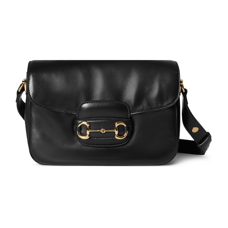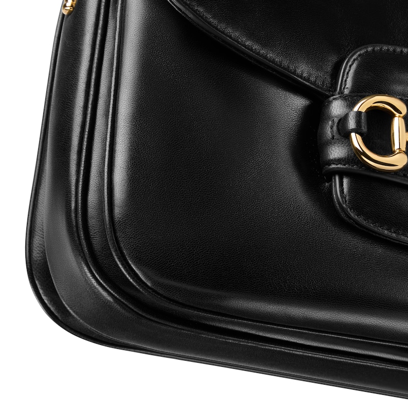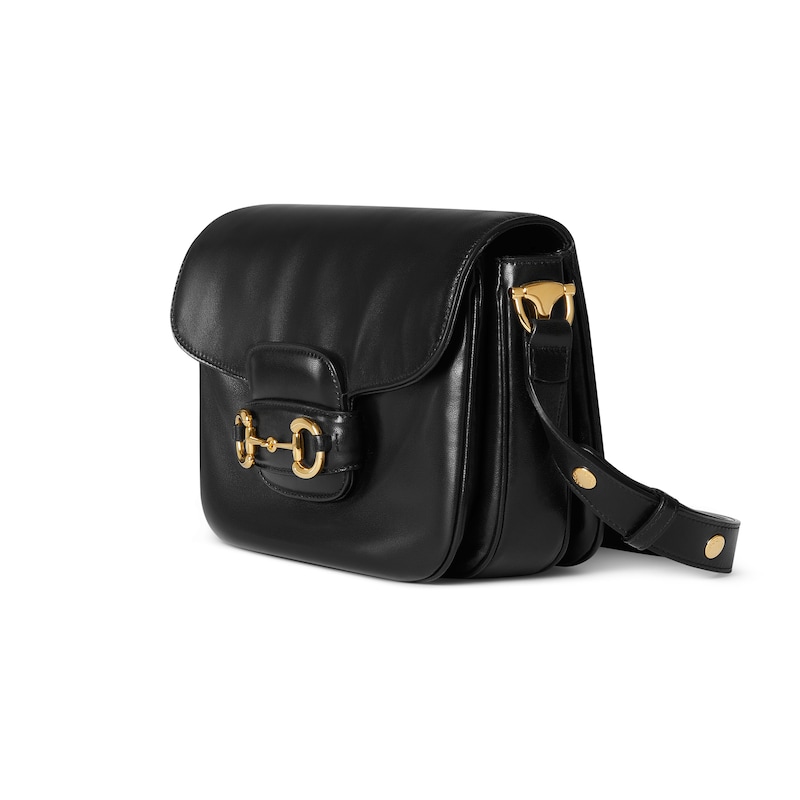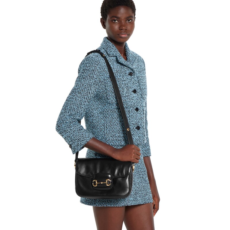 2025秋冬系列, 这款肩背包再现品牌马术风格设计,融蕴浅金色调细节与光面软皮,搭配双环和长条配件,为Gucci Horsebit 1955系列添砖加瓦。