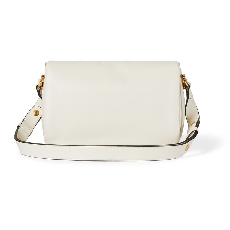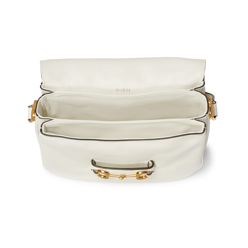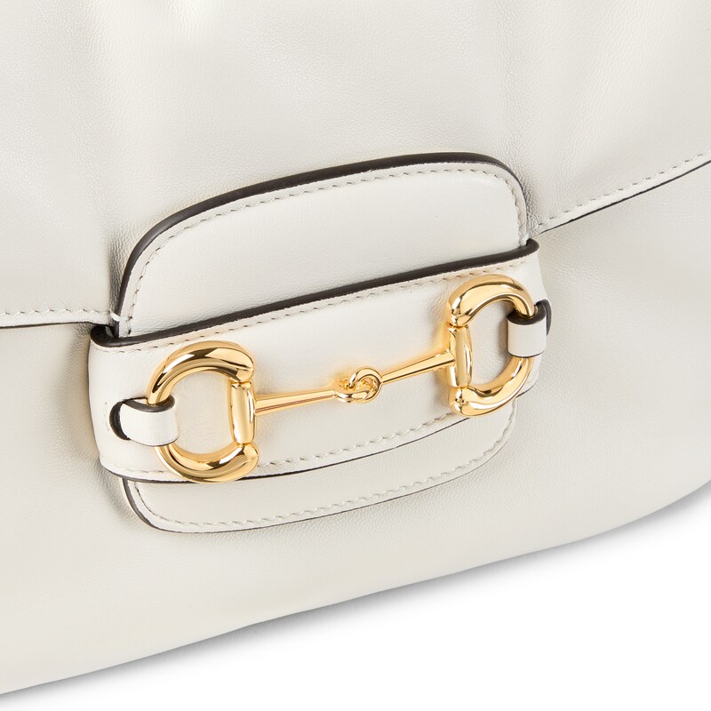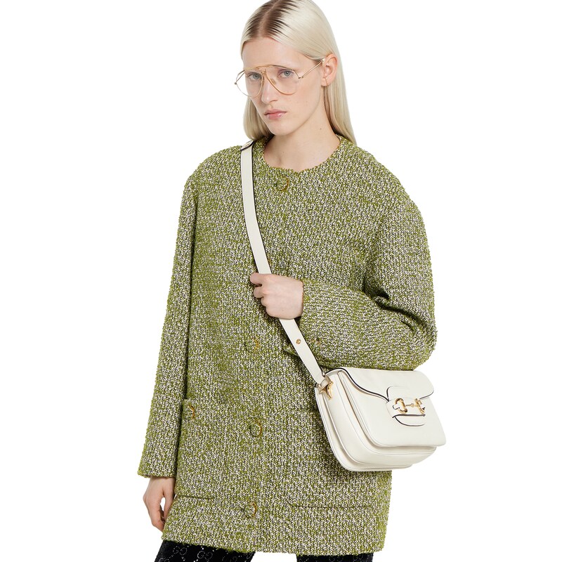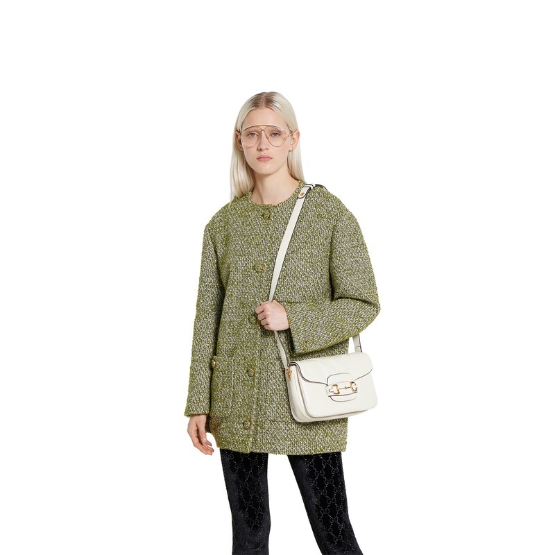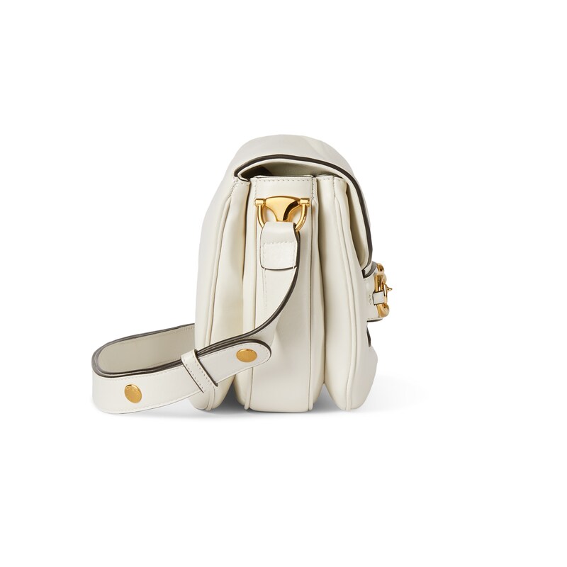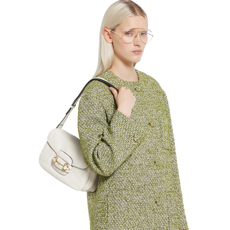2025秋冬系列, 这款肩背包再现品牌马术风格设计,融蕴浅金色调细节与光面软皮,搭配双环和长条配件,为Gucci Horsebit 1955系列添砖加瓦。
