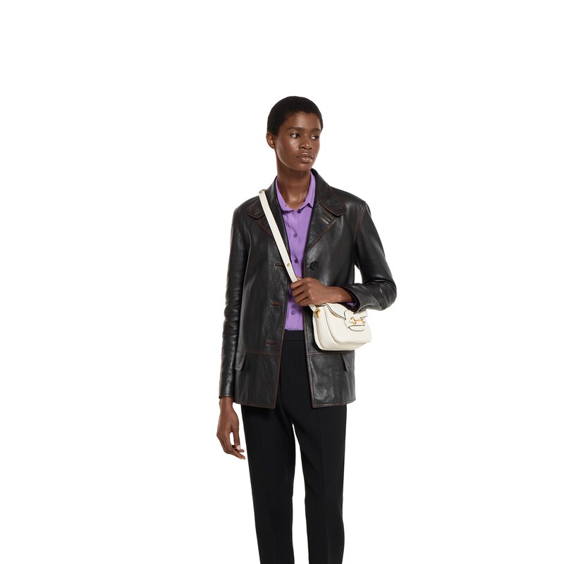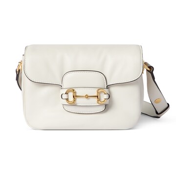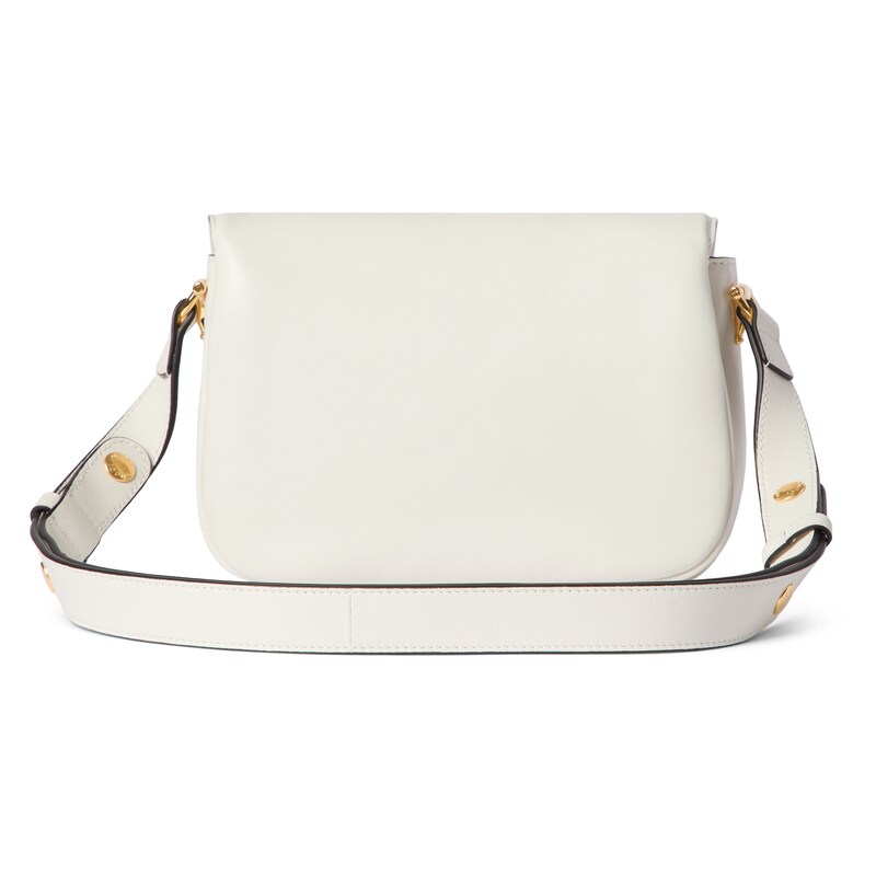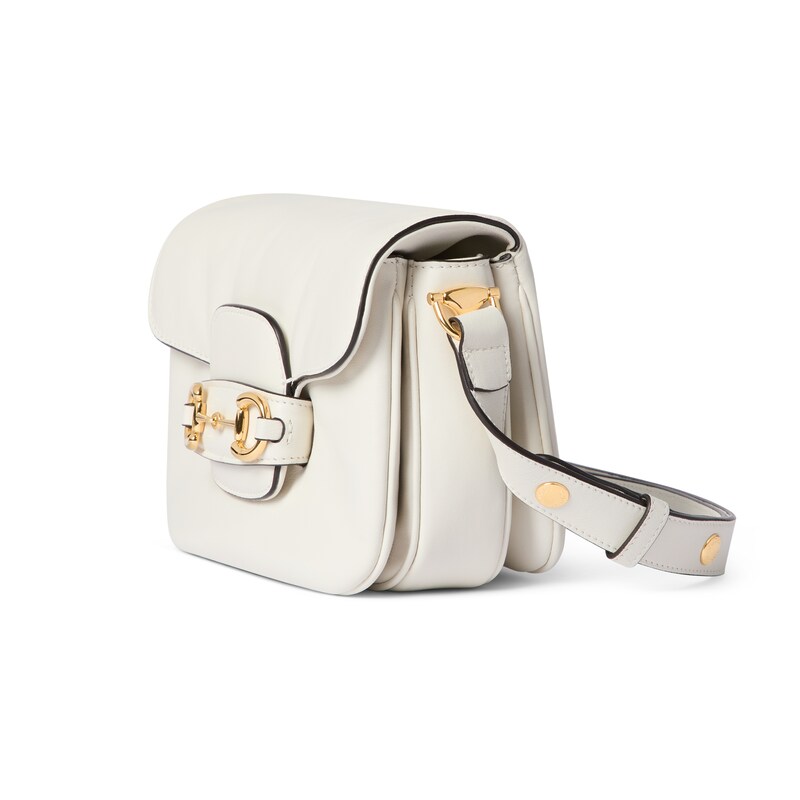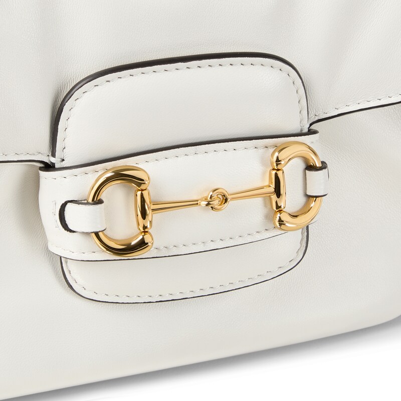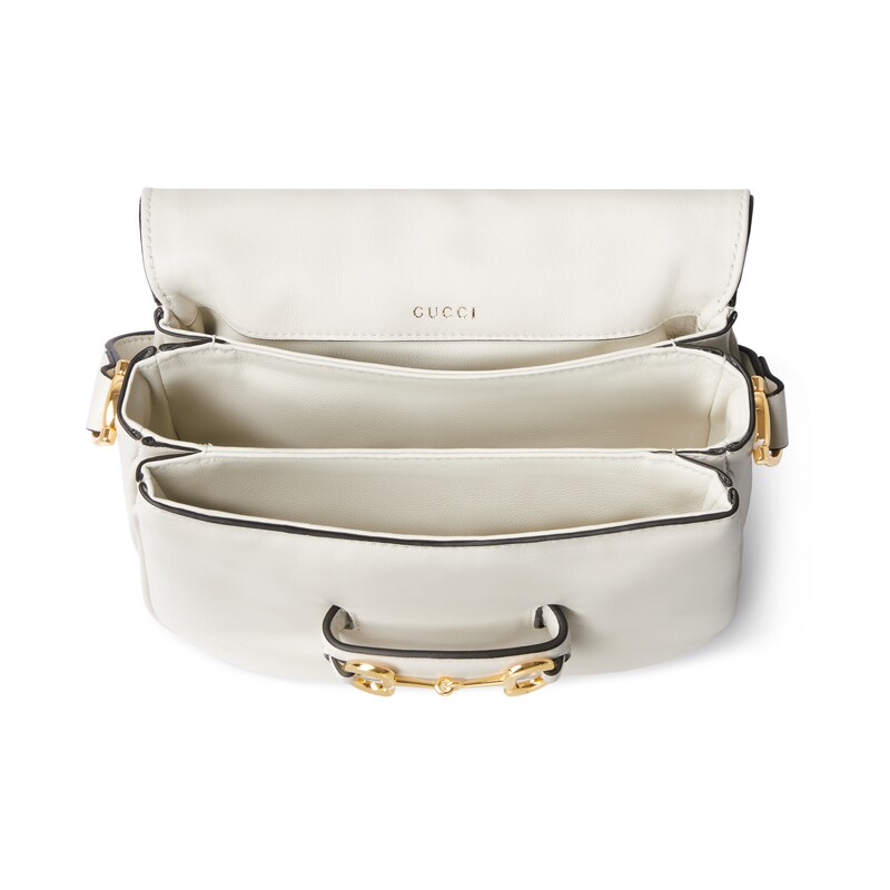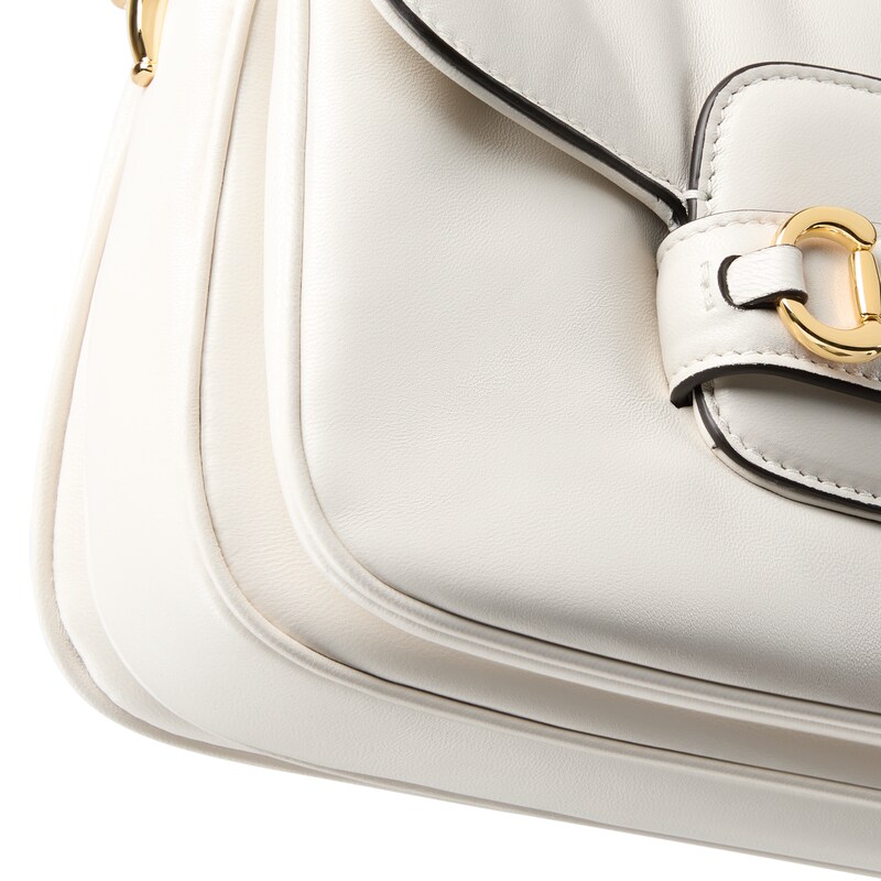 2025秋冬系列, 这款肩背包再现品牌马术风格设计,融蕴浅金色调细节与光面软皮,搭配双环和长条配件,为Gucci Horsebit 1955系列添砖加瓦。