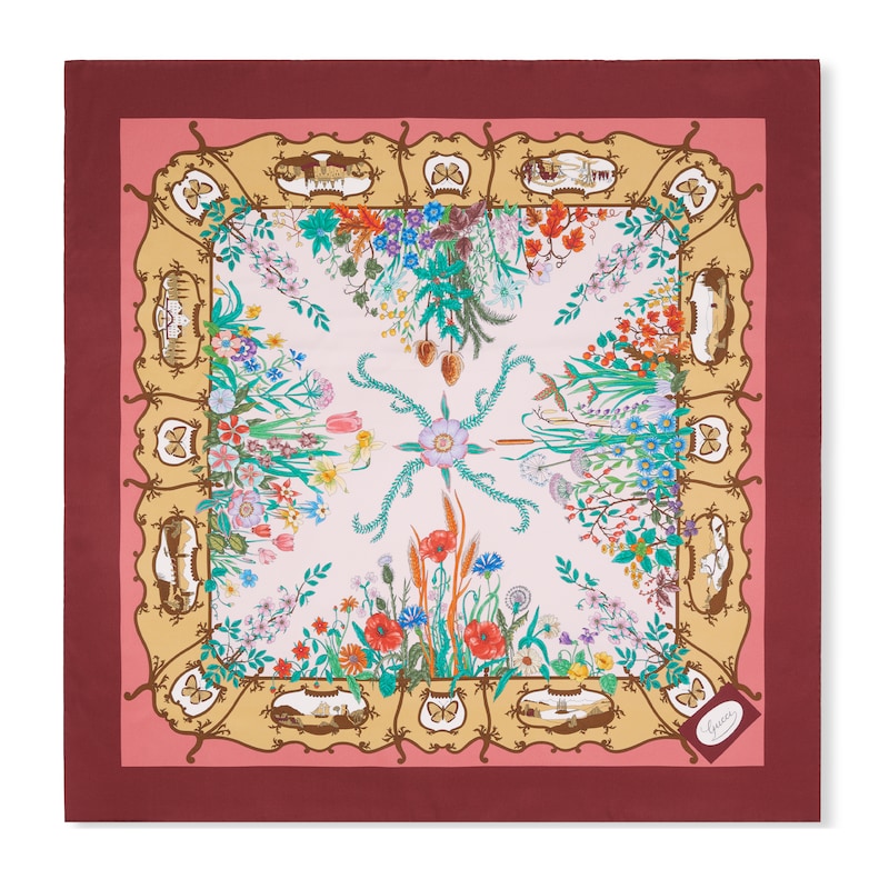 这款斜纹桑蚕丝方巾通体缀饰Gucci意大利花园印花,为2025秋冬系列再添新作。