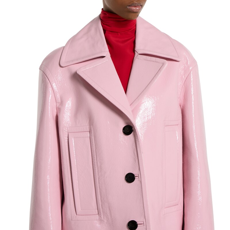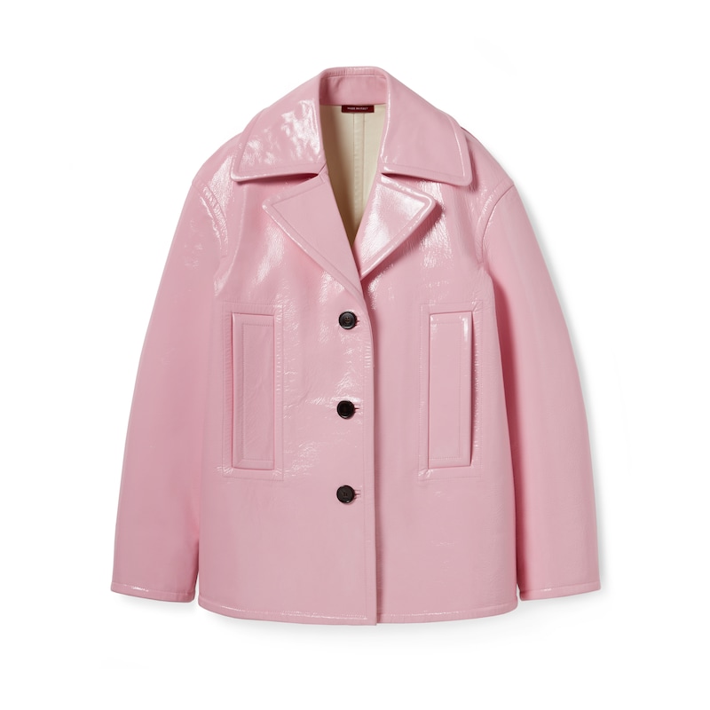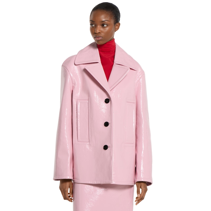 2025秋冬系列以亮泽材质和挺括廓形焕新演绎经典外套设计。这款夹克采用Naplak皮革打造,匠心点缀牛角扣细节。