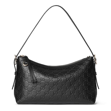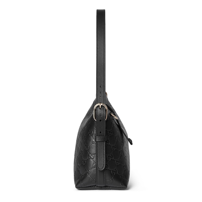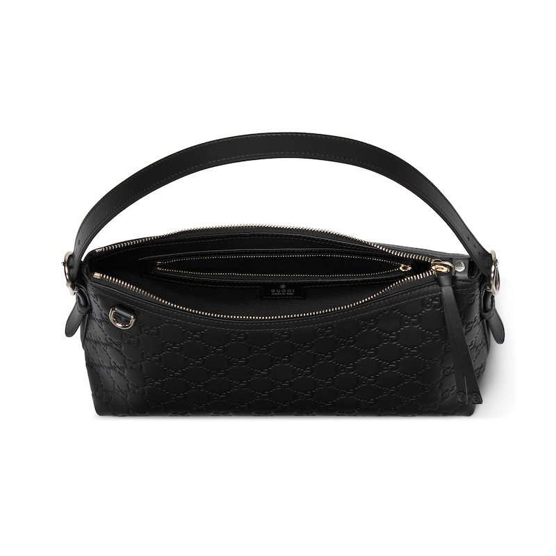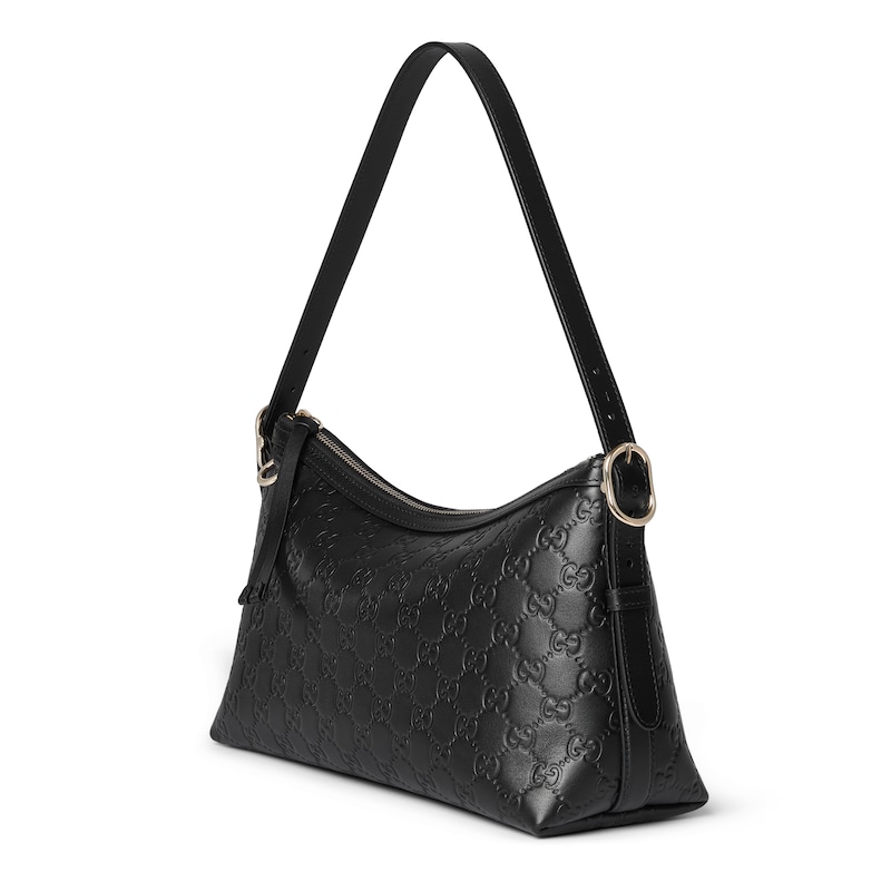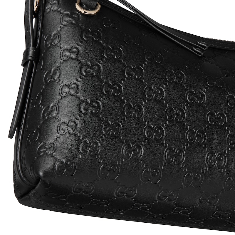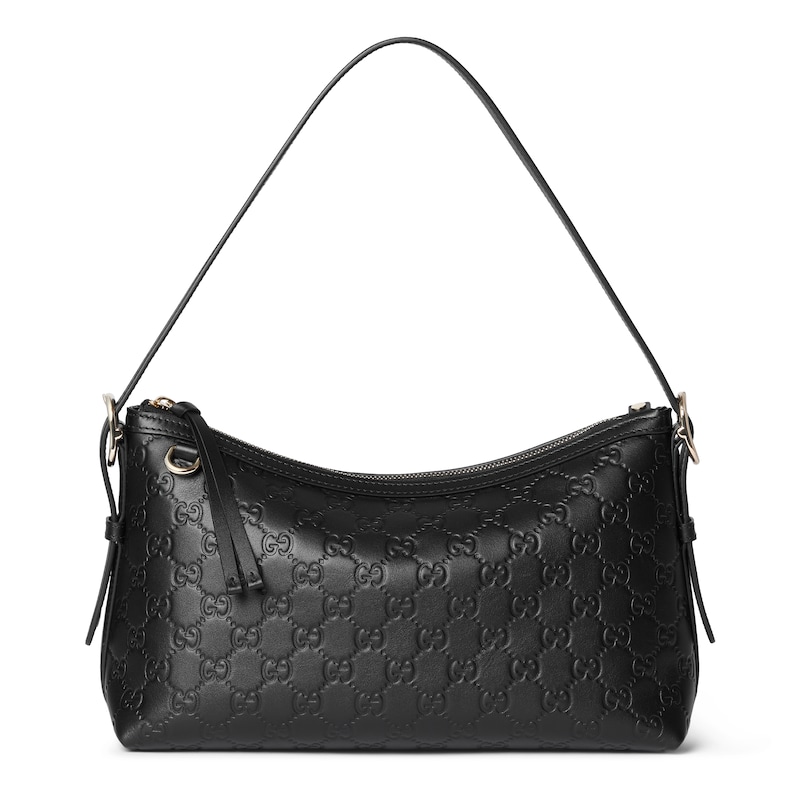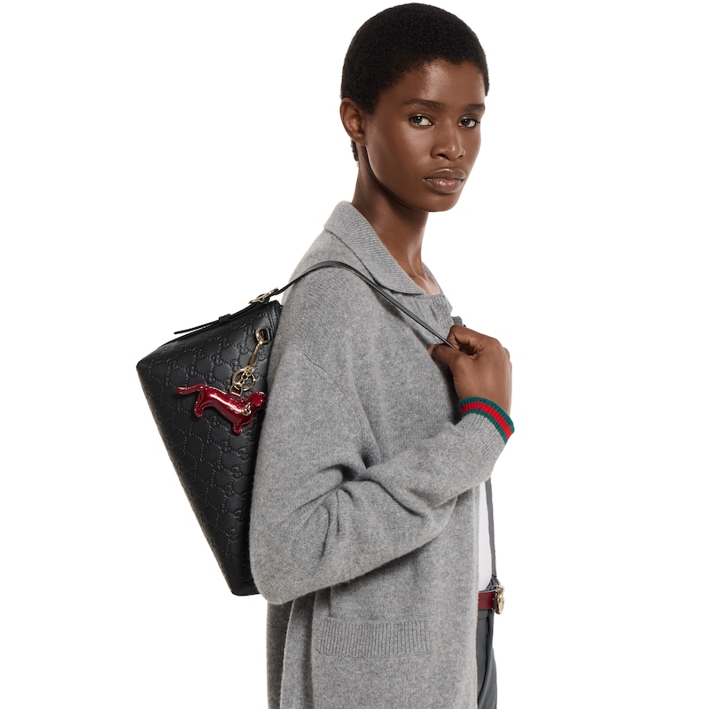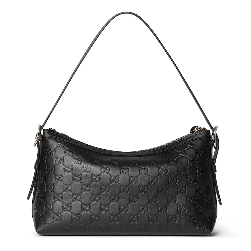 2025秋冬系列, GG Emblem系列焕新诠释品牌的隽永优雅风范和精湛工艺。这款肩背包采用GG压花牛皮革匠心制作,尽显精致纹理。
