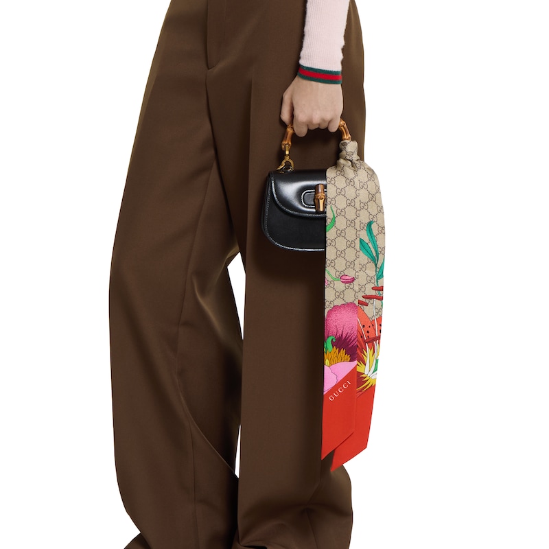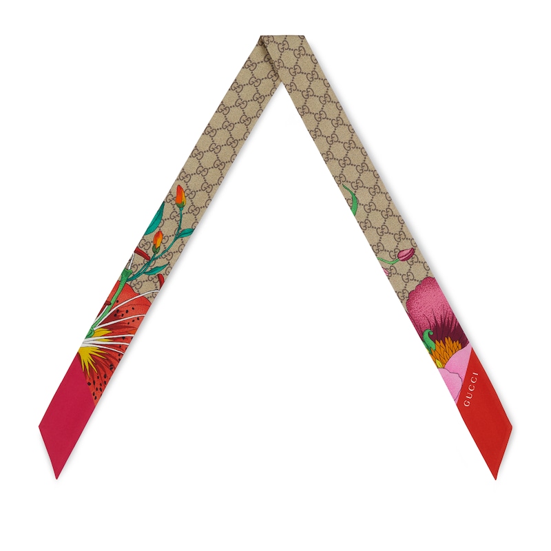 2025秋冬系列选用柔和色调焕新诠释标志性GG图案。这款丝带以GG桑蚕丝匠心打造,缀饰柔美的Flora花卉印花。
