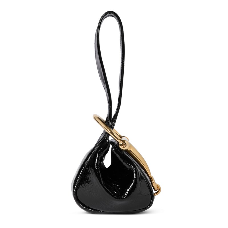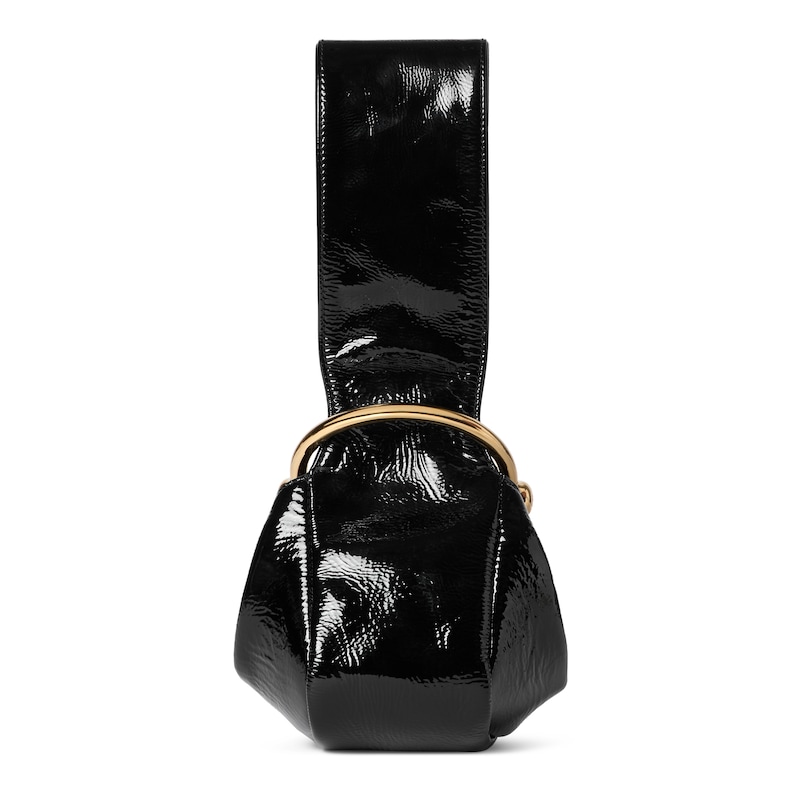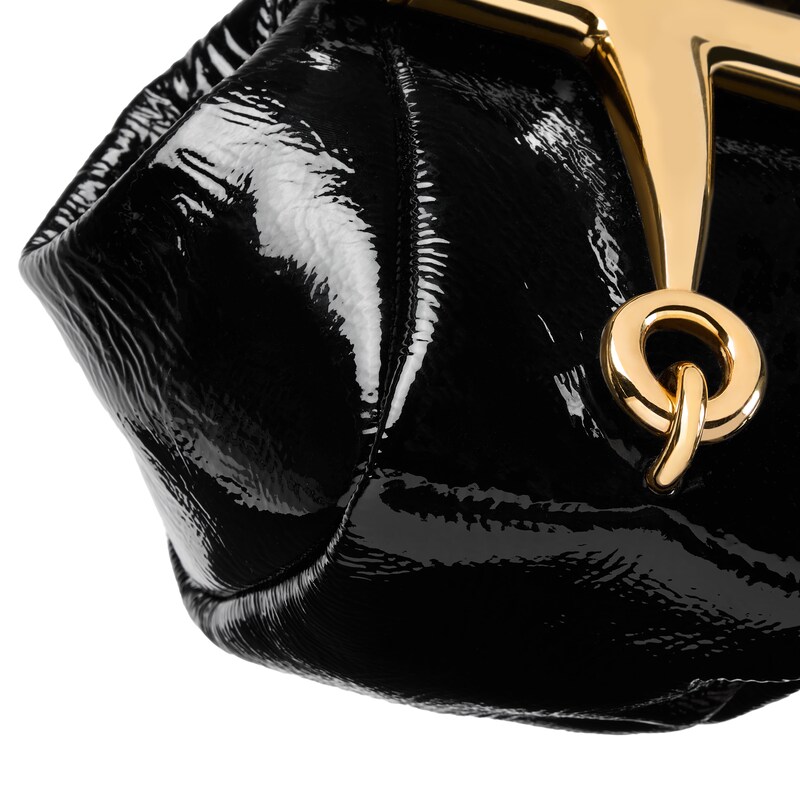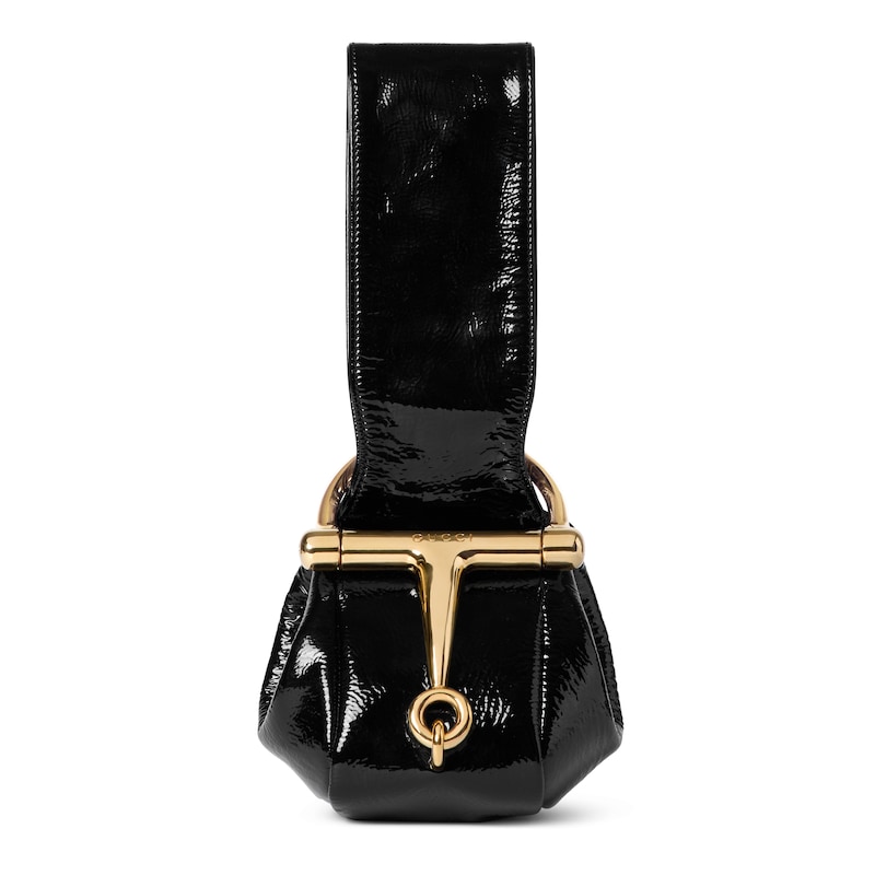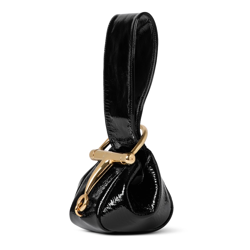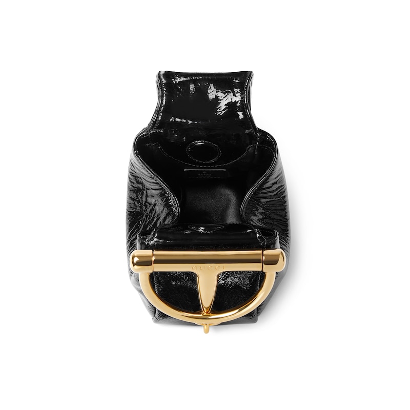 2025秋冬系列, 这款晚宴手拿包缀饰标志性半马衔扣细节,演绎承袭品牌马术本源的配件设计。这款晚宴手拿包采用漆皮匠心打造,搭配金色调配饰,以现代廓形焕新演绎隽永款式。