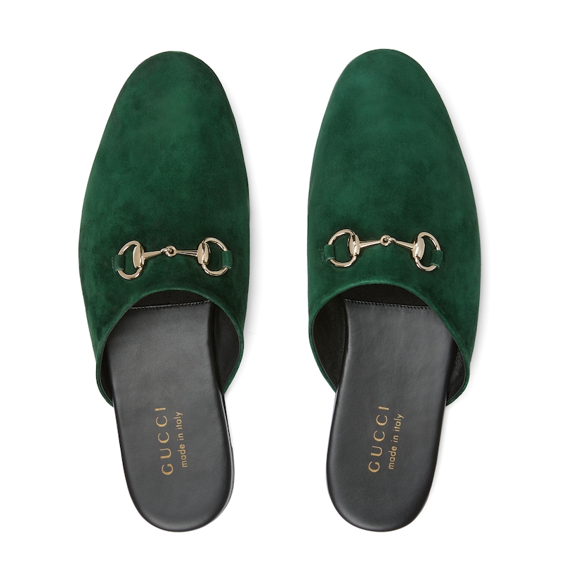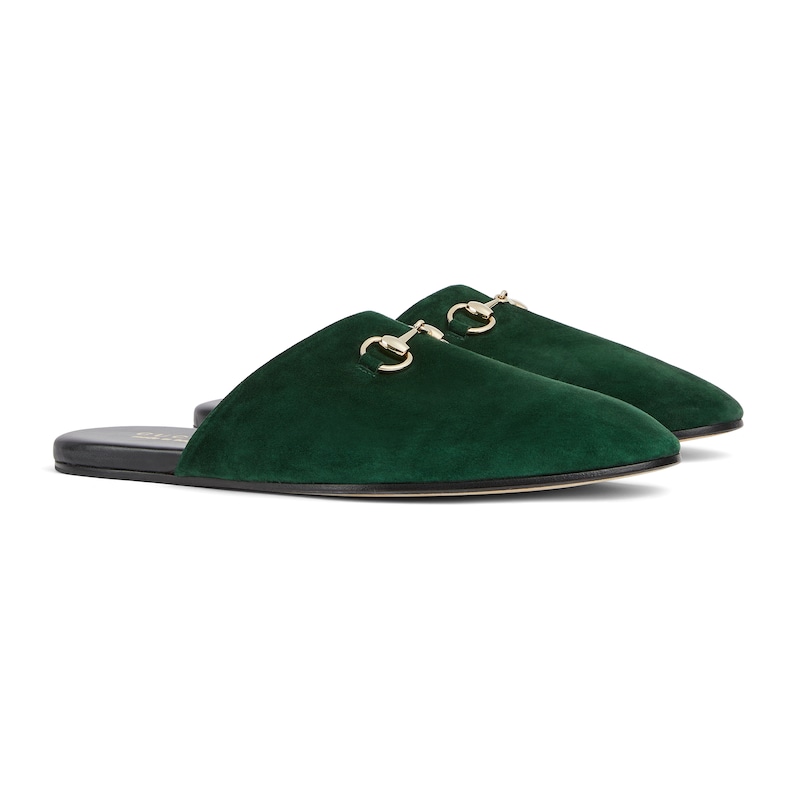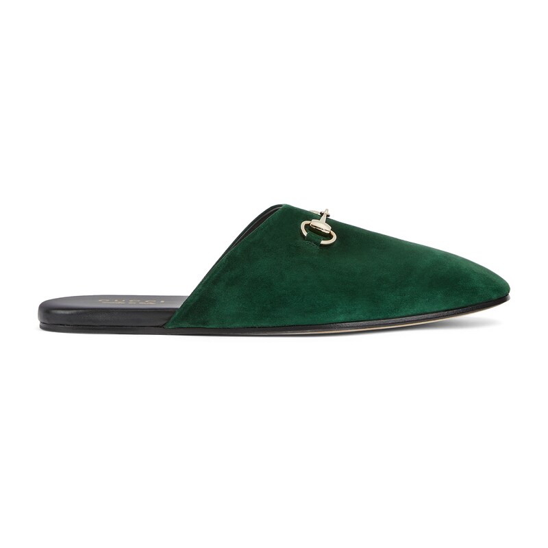2025秋冬系列, 典藏图案继续在Gucci全新系列中大放异彩。全新系列匠心呈献马衔扣配件,彰显品牌马术传承。这款男士穆勒鞋采用光滑绒面材质匠心打造,搭配浅金色调配件增添亮眼细节。
