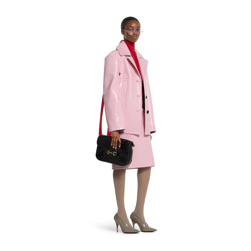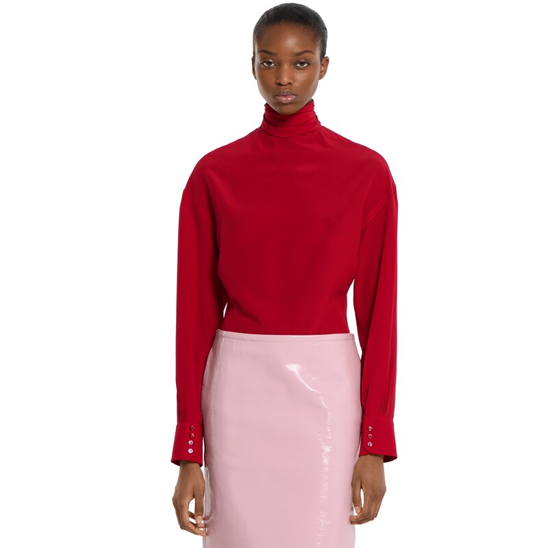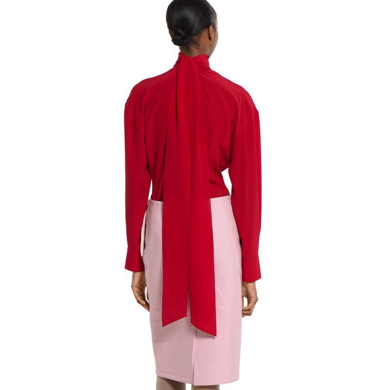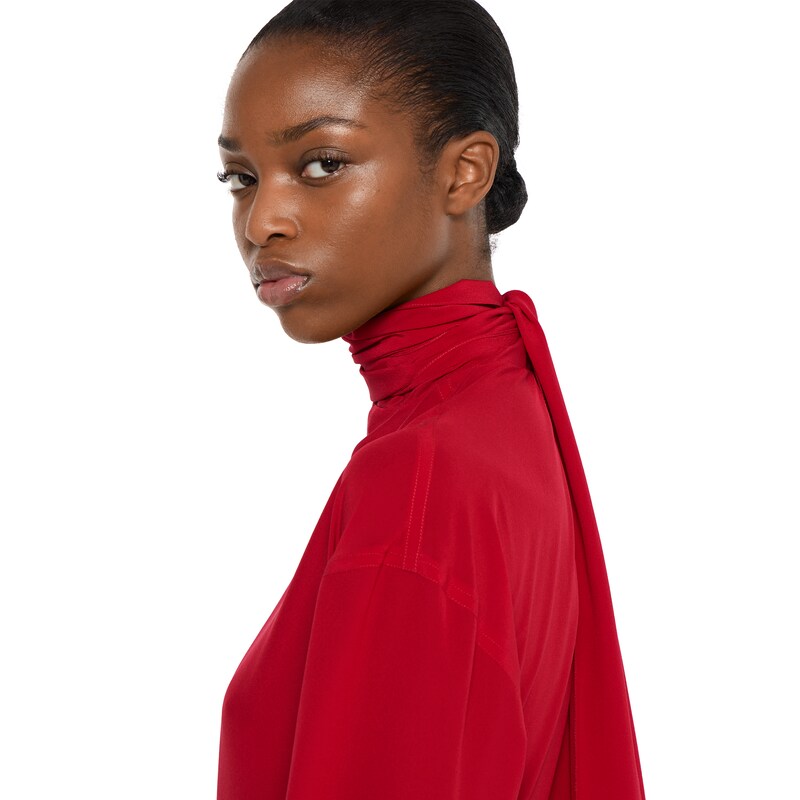 2025秋冬系列中的这款长袖衬衫采用双绉面料匠心打造,搭配飘带领设计。落肩设计和饰纽扣袖口匠心演绎柔软而不失挺括的精致廓形。