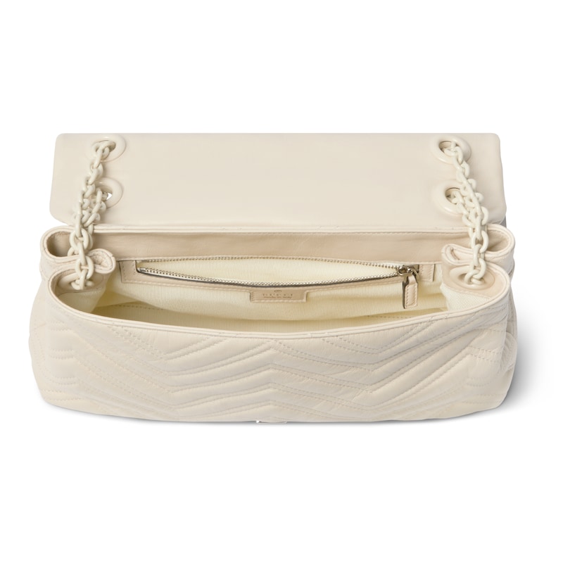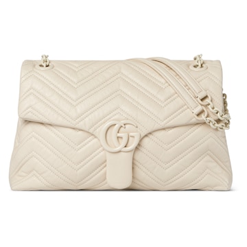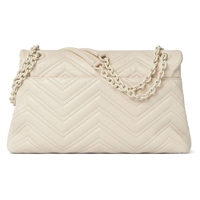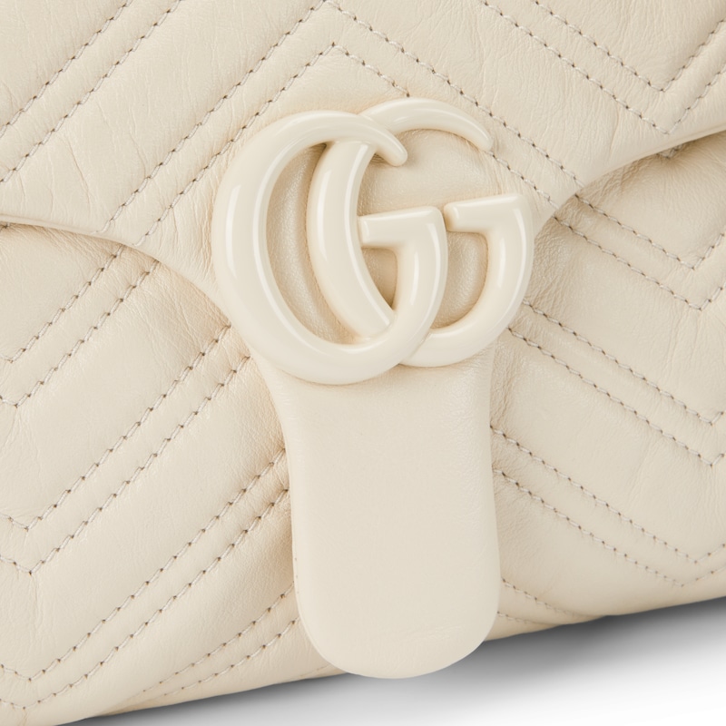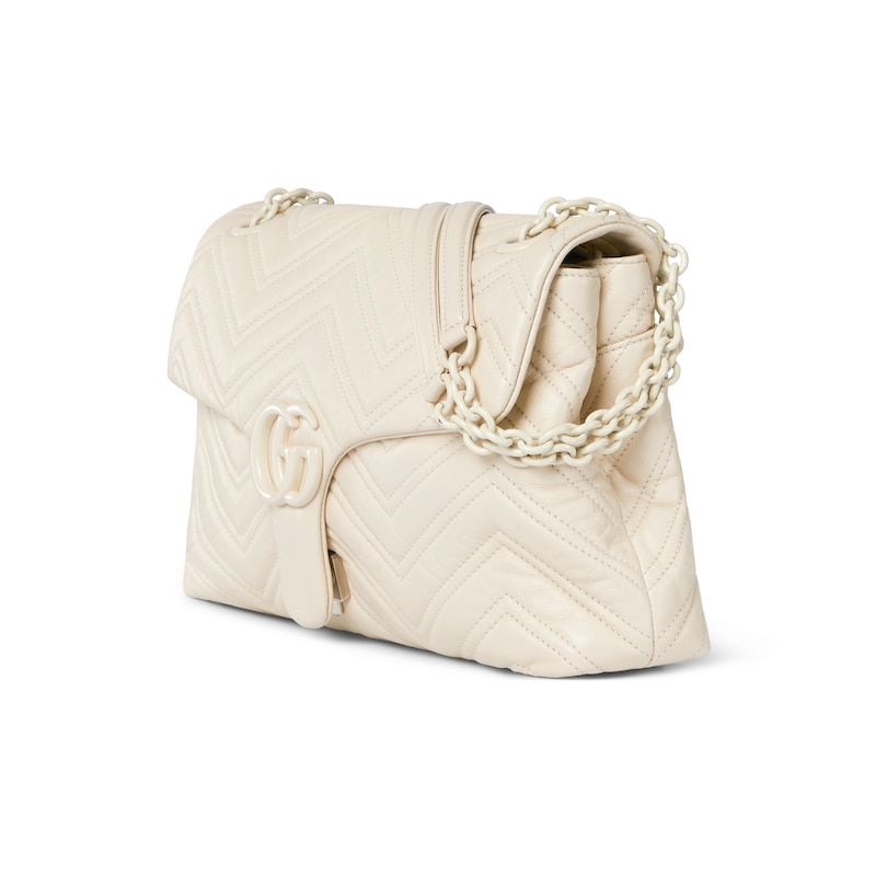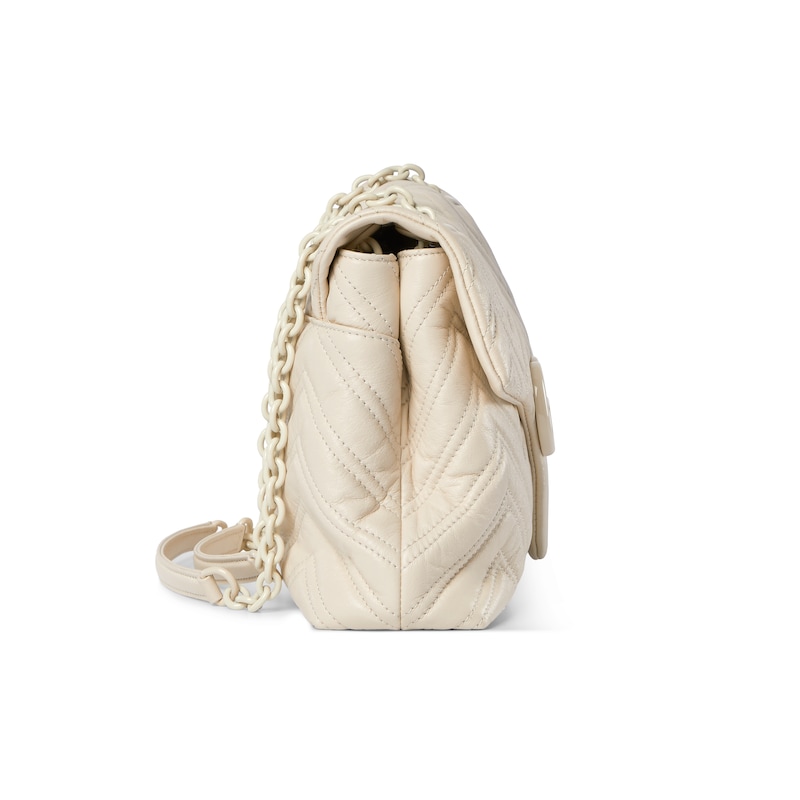 2025秋冬系列, 品牌标志性GG Marmont系列匠心融蕴经典双G元素和切面链式包带,缔就柔软不失挺括的廓形设计。这款单品采用柔软轻质绗缝V型皮革匠造而成,搭配同色调珐琅配件与链条。