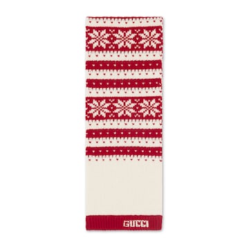 品牌童装系列以经典材质、精湛工艺与清新色调焕新诠释标志性图案。这款儿童围巾甄选羊毛提花打造,巧妙融入Gucci嵌花。