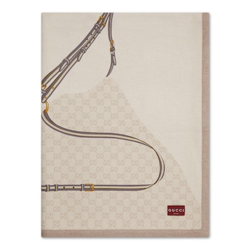 Gucci家饰系列秉承经典,以奢华材质、精湛工艺与清新色调焕新演绎GG、织带、竹节、马衔扣及马术元素等品牌经典图案。这款盖毯以羊毛匠心打造,配以同色调滚边和马术风格印花。