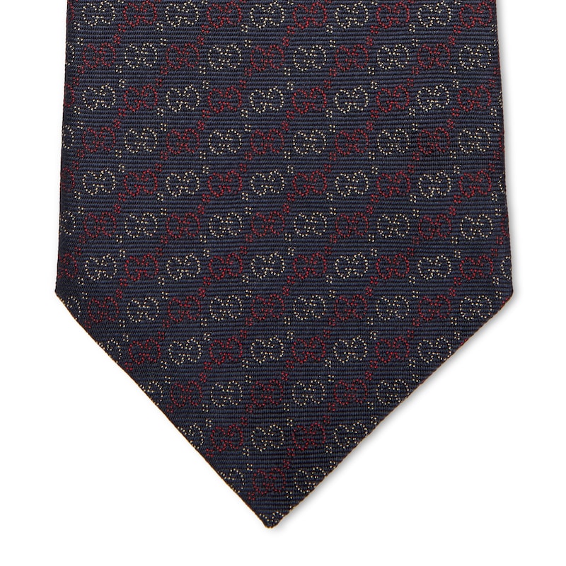 2026早春系列男士桑蚕丝配饰植根于品牌典藏设计,匠心结合丰蕴传承与现代风尚。这款领带以GG桑蚕丝提花面料匠心打造,致意品牌经典字母交织图案。